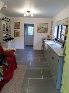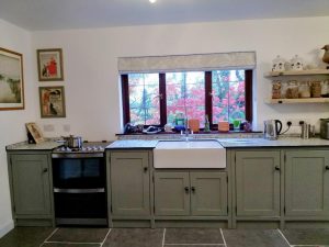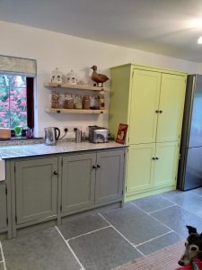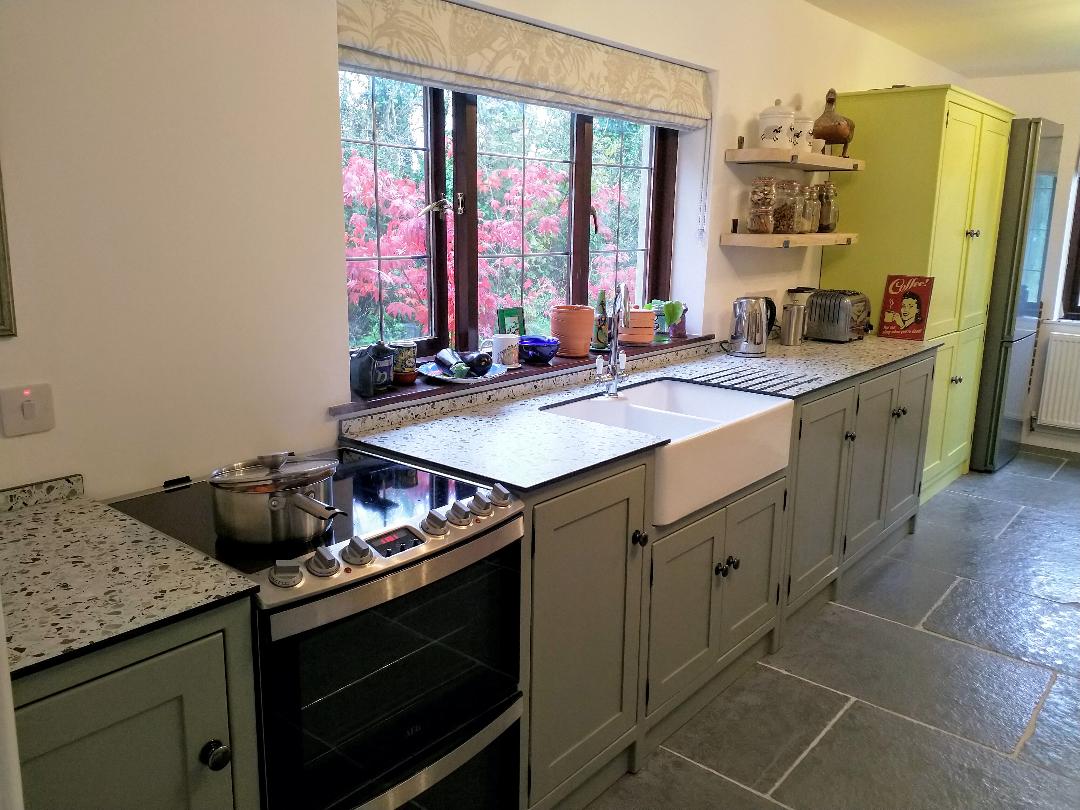 Dawn’s new kitchen with solid compact laminate worktop.