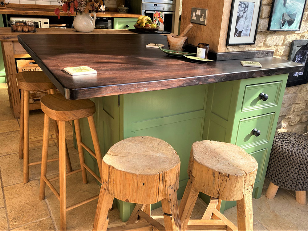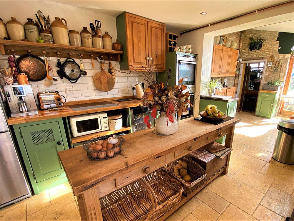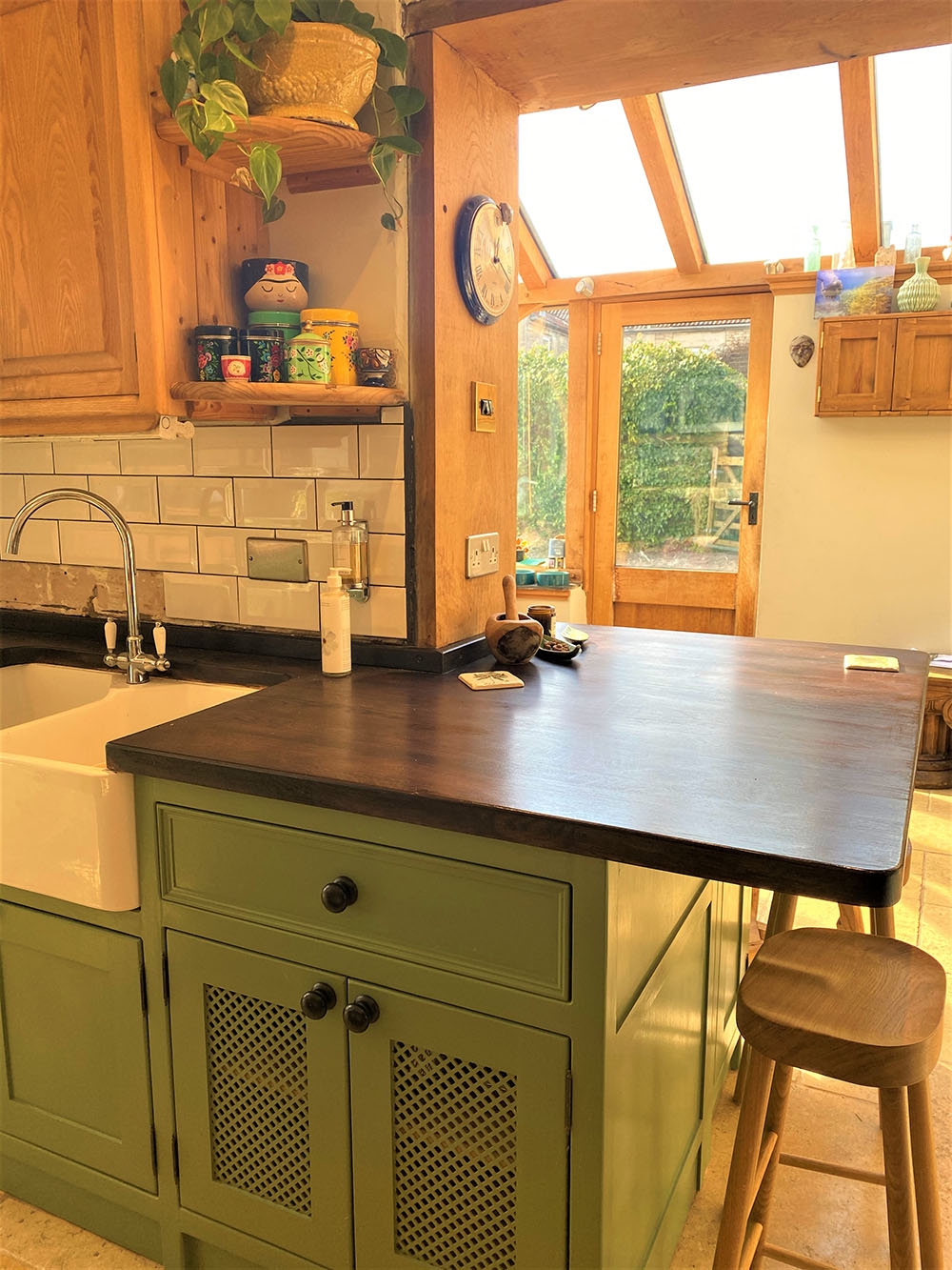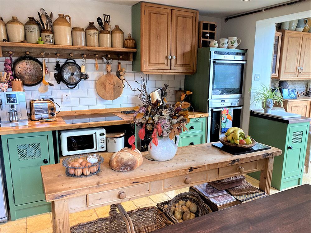 Jill’s eclectic vintage style kitchen in ‘caulk green’