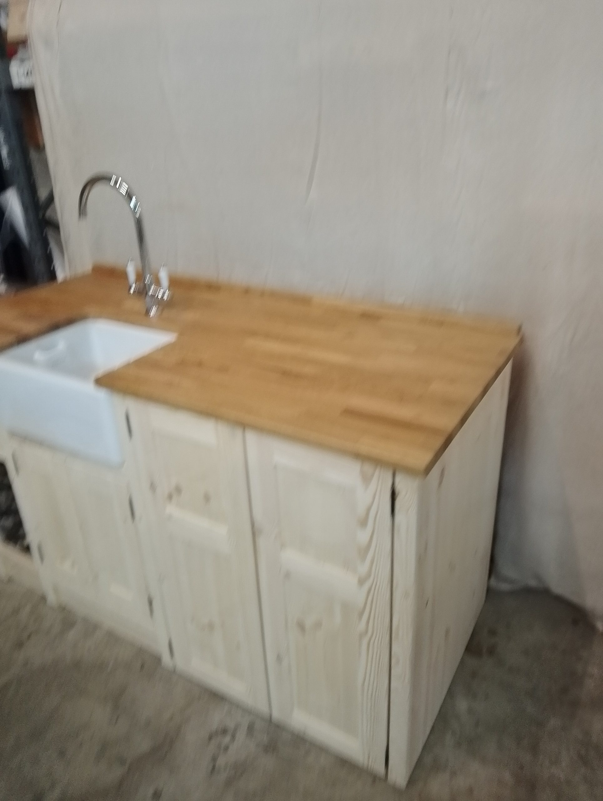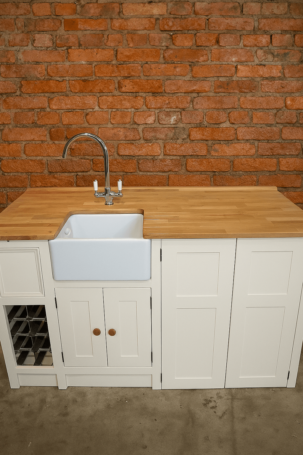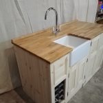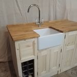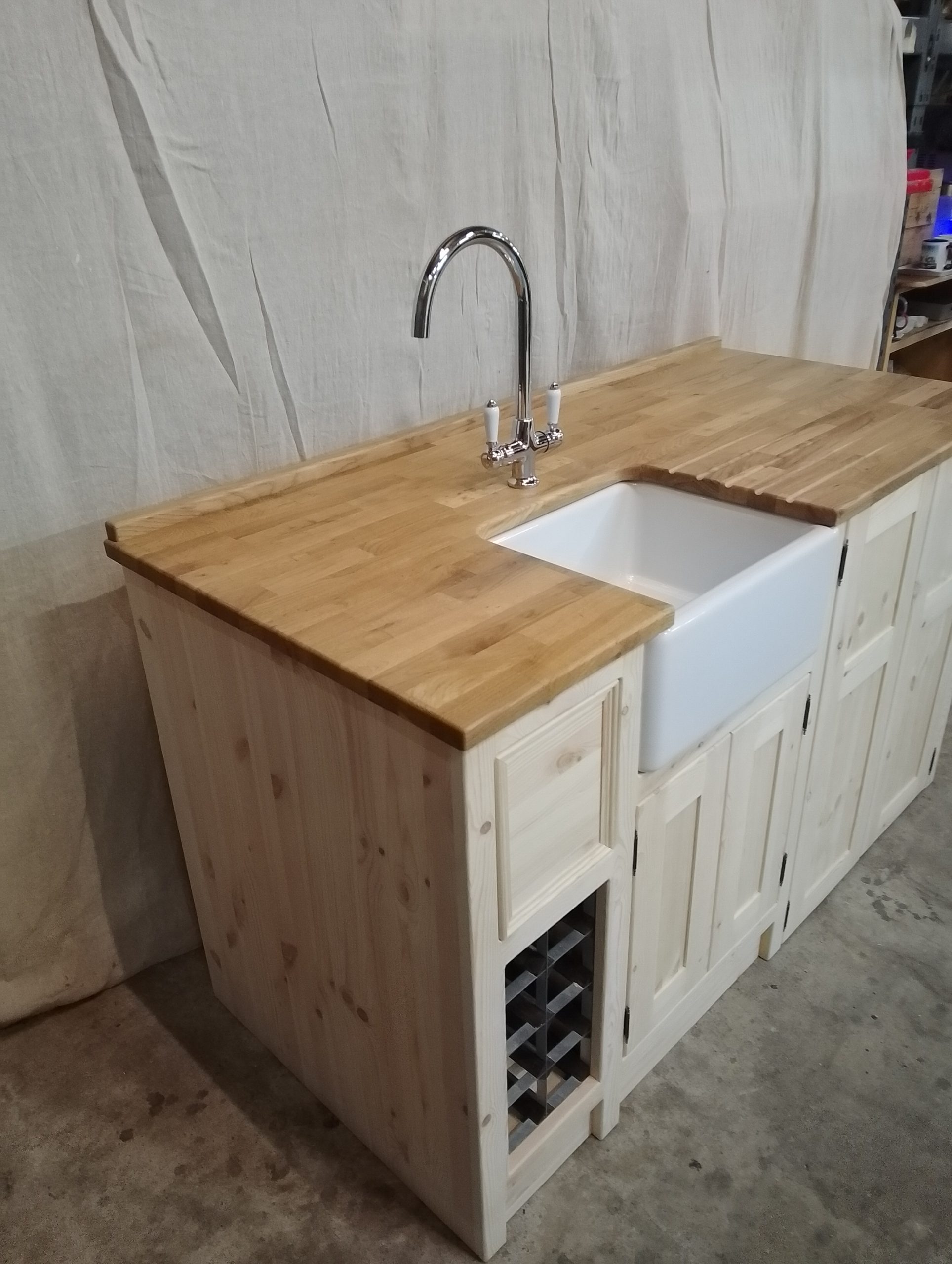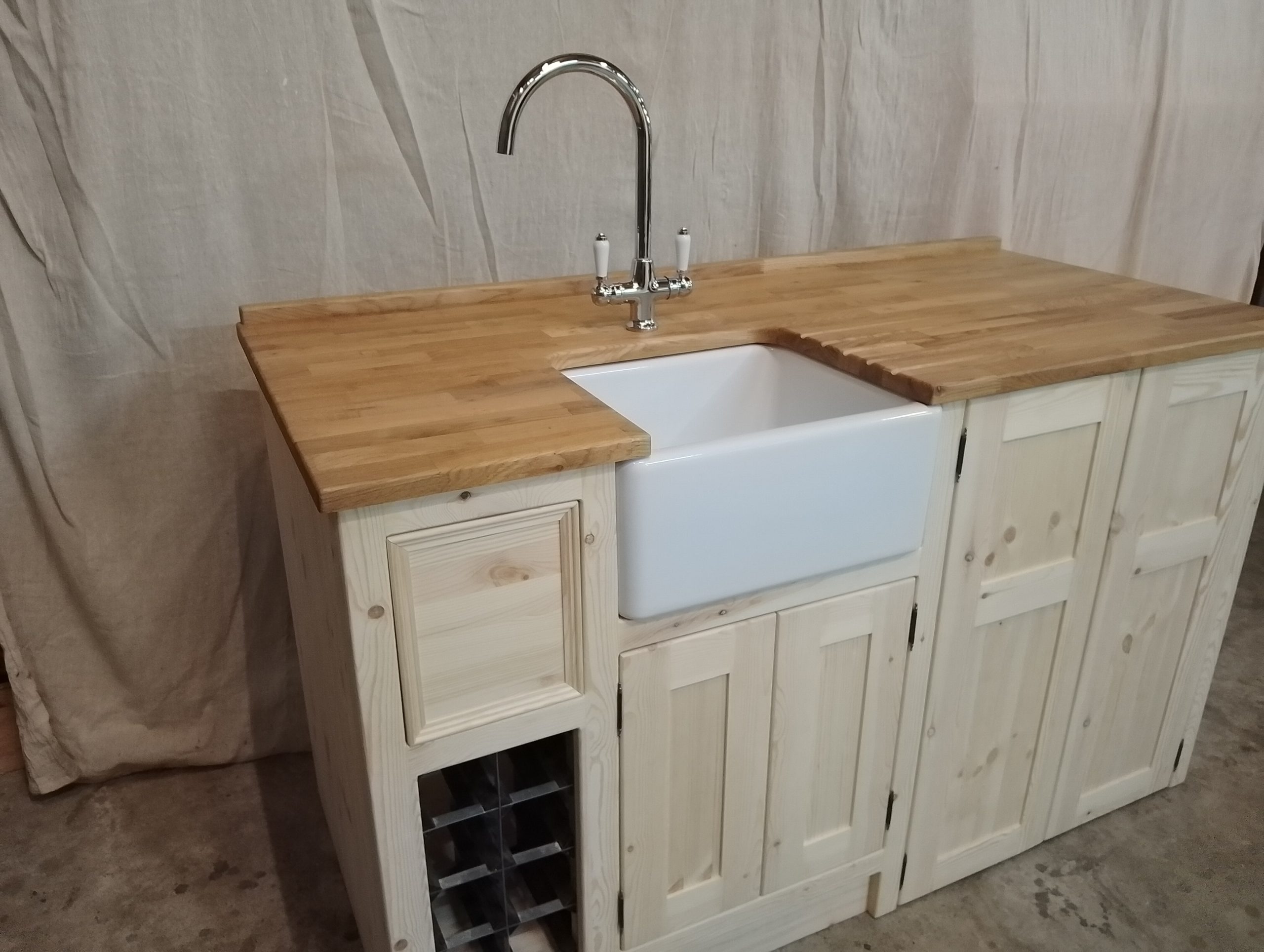 This unit has been made with solid pine and is fitted with the 25mm oak worktop option. Containing a mini Belfast sink/ metal wine rack/housing for a standard 600mm appliance and a chrome lever tap.