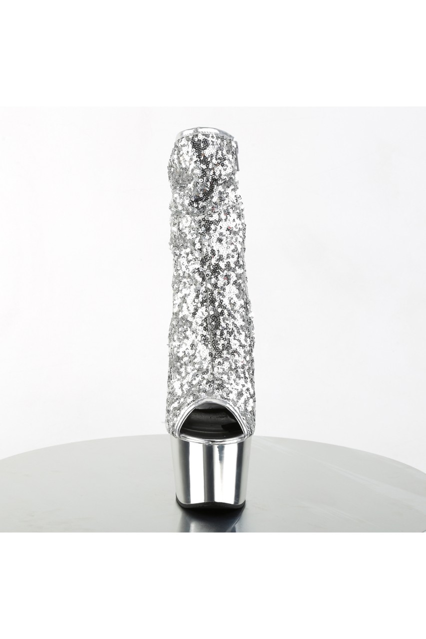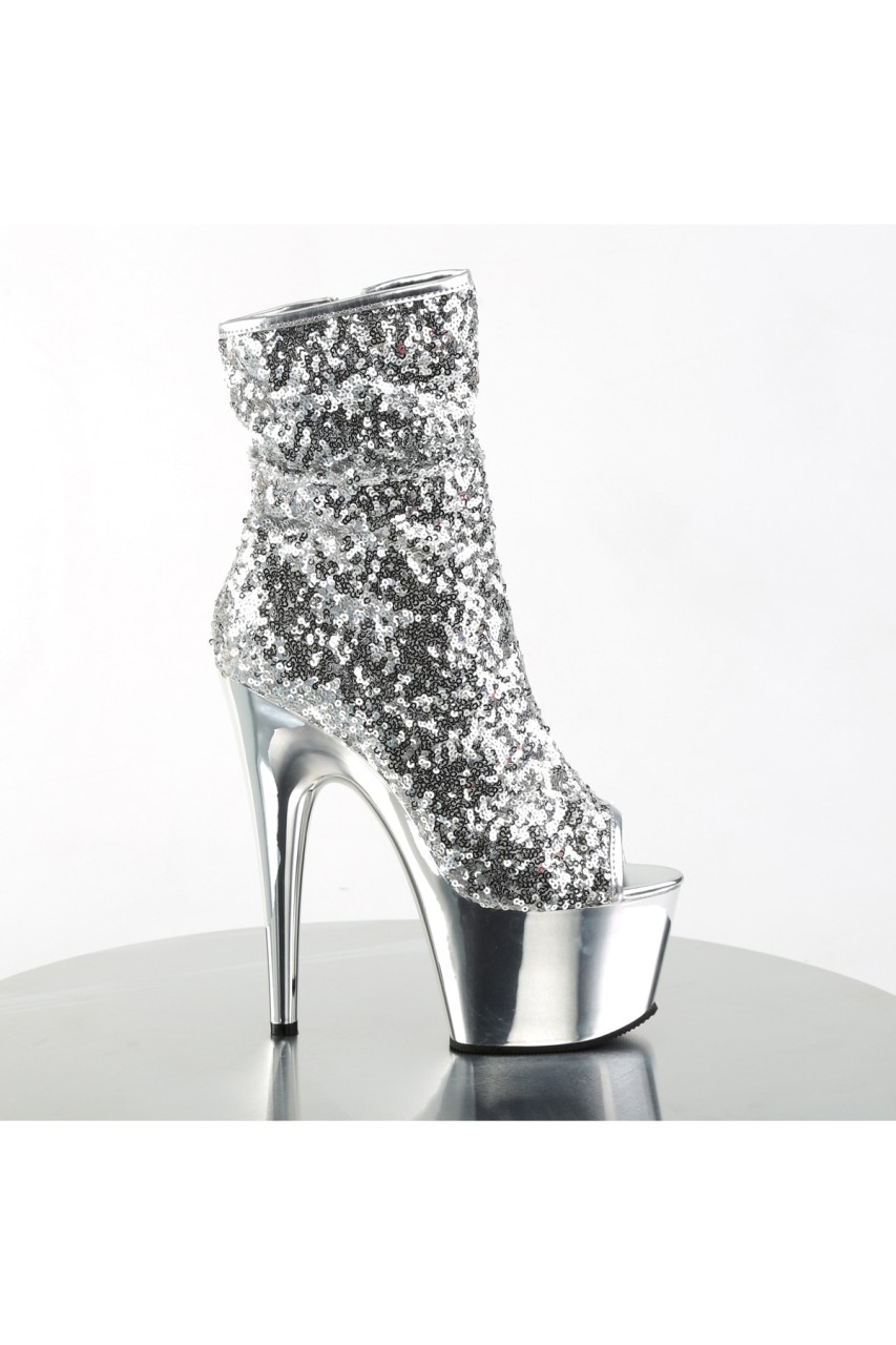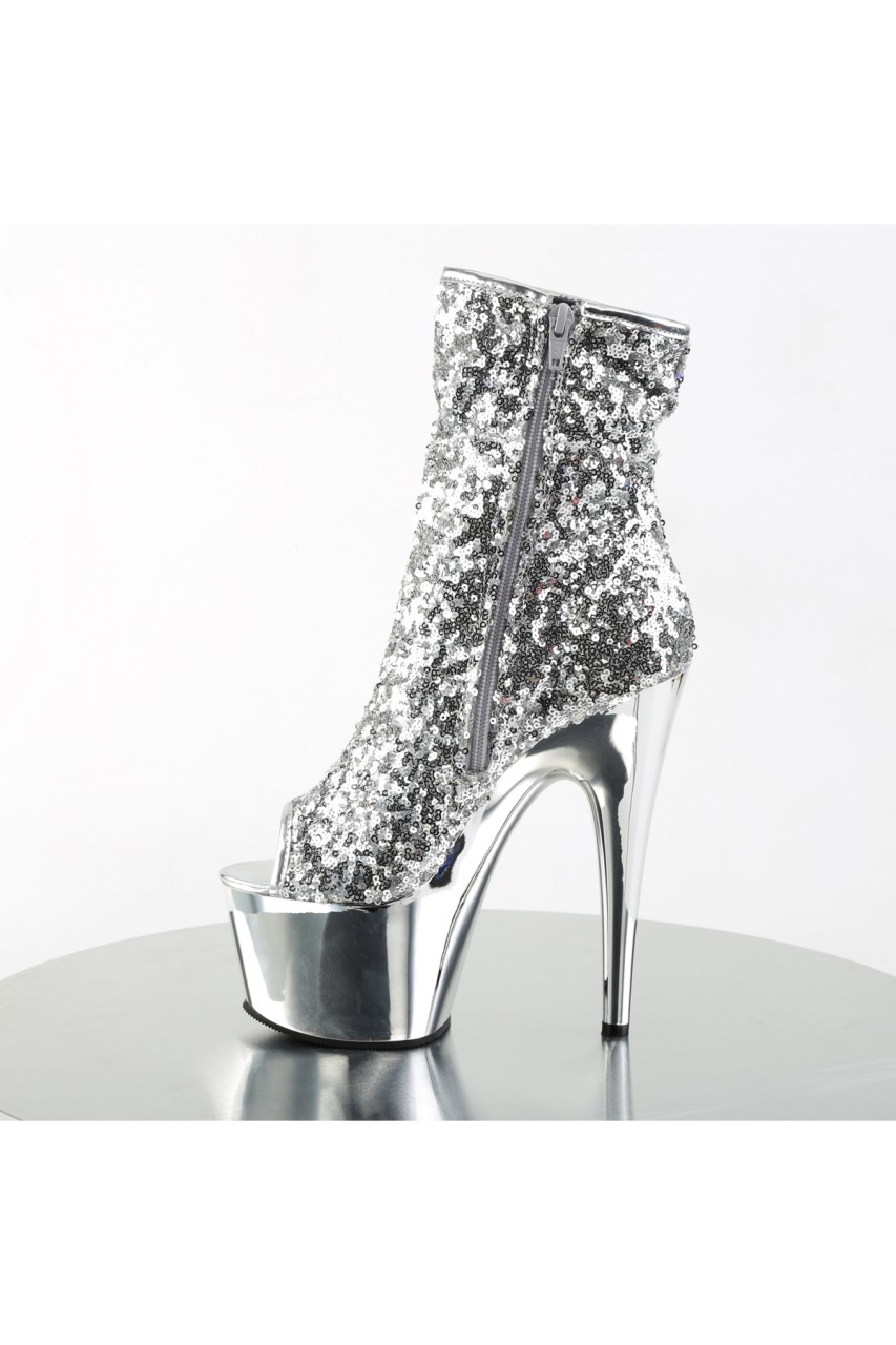 7″” (17.8cm) Stiletto Heel, 2 3/4″” (7cm) Chrome Plated Platform Peep Toe Ruched Shaft Ankle Boot, Inner Side Zip Closure