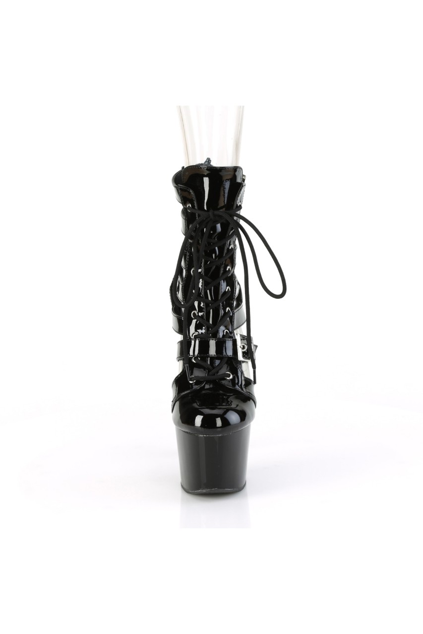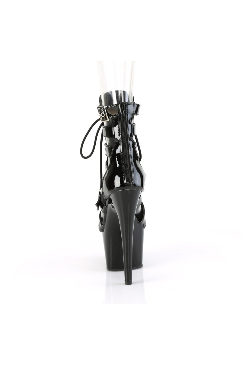 7″” (178mm) Heel, 2 3/4″” (70mm) Platform Strappy Dual Adjustable Buckled Strap Lace-Up Front Cage Bootie, Back Zip Closure