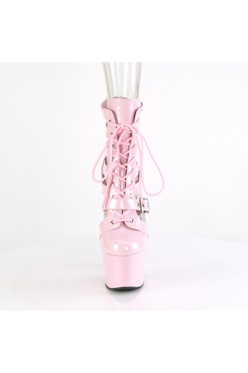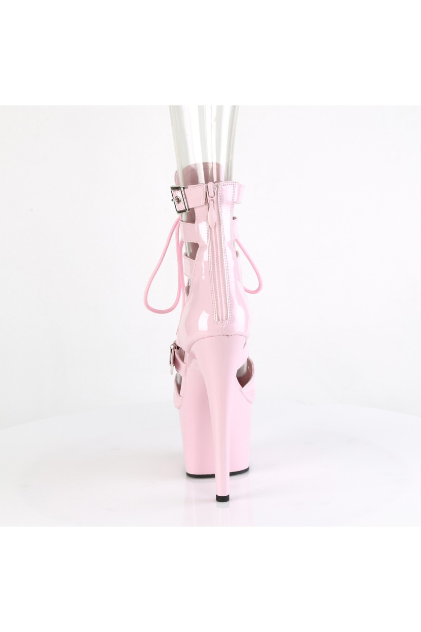 7″” (178mm) Heel, 2 3/4″” (70mm) Platform Strappy Dual Adjustable Buckled Strap Lace-Up Front Cage Bootie, Back Zip Closure