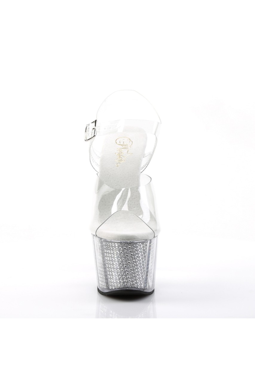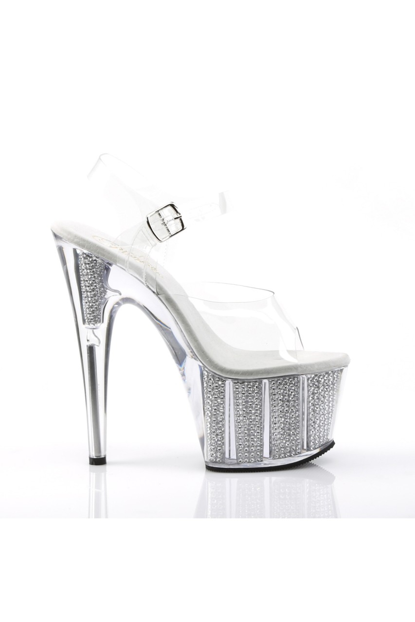7″” (17.8cm) Stiletto Heel, 2 3/4″” (7cm) Platform Ankle Strap Sandal Featuring Simulated Rhinestone Filled Platform