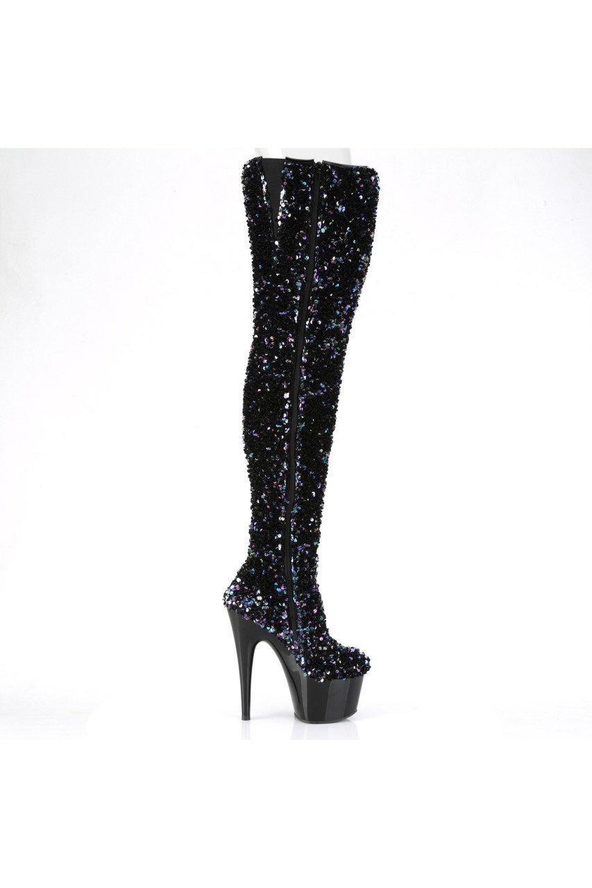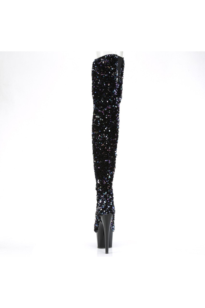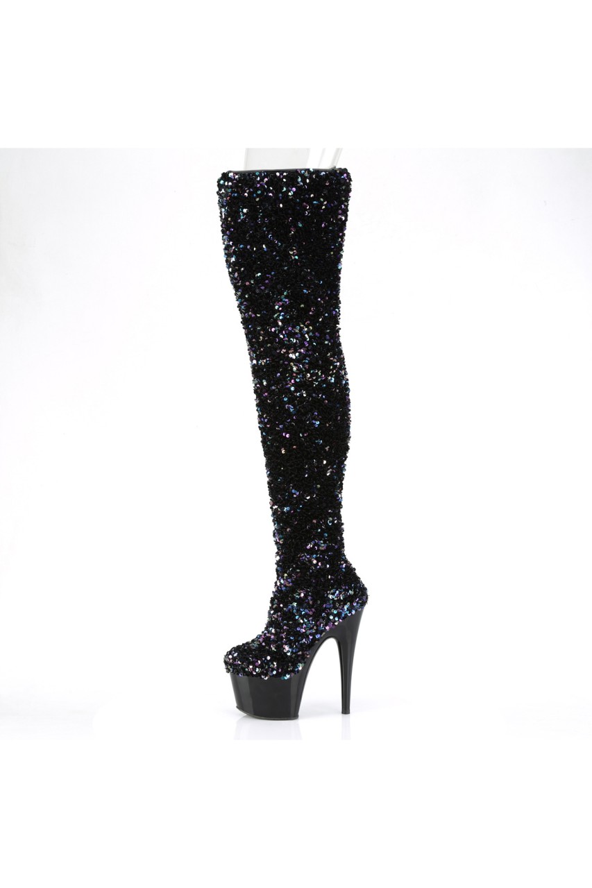7″” (178mm) Heel, 2 3/4″” (70mm) Platform Stretch Sequin Thigh High Boot Featuring Multi Sequined Body, Inner Side Zip Closure