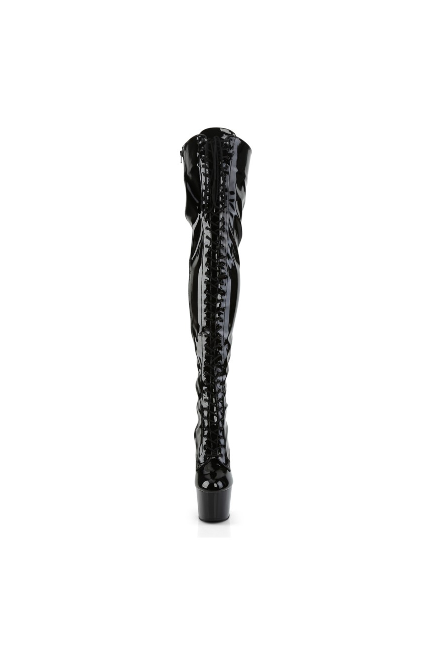 7″” (17.8cm) Stiletto Heel, 2 3/4″” (7cm) Platform Front Lace-Up Stretch Platform Thigh High Boot, Full Side Zip Closure