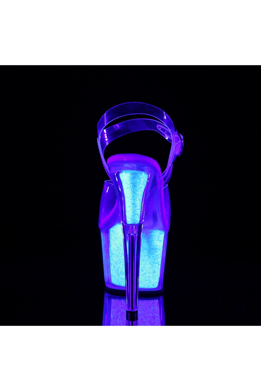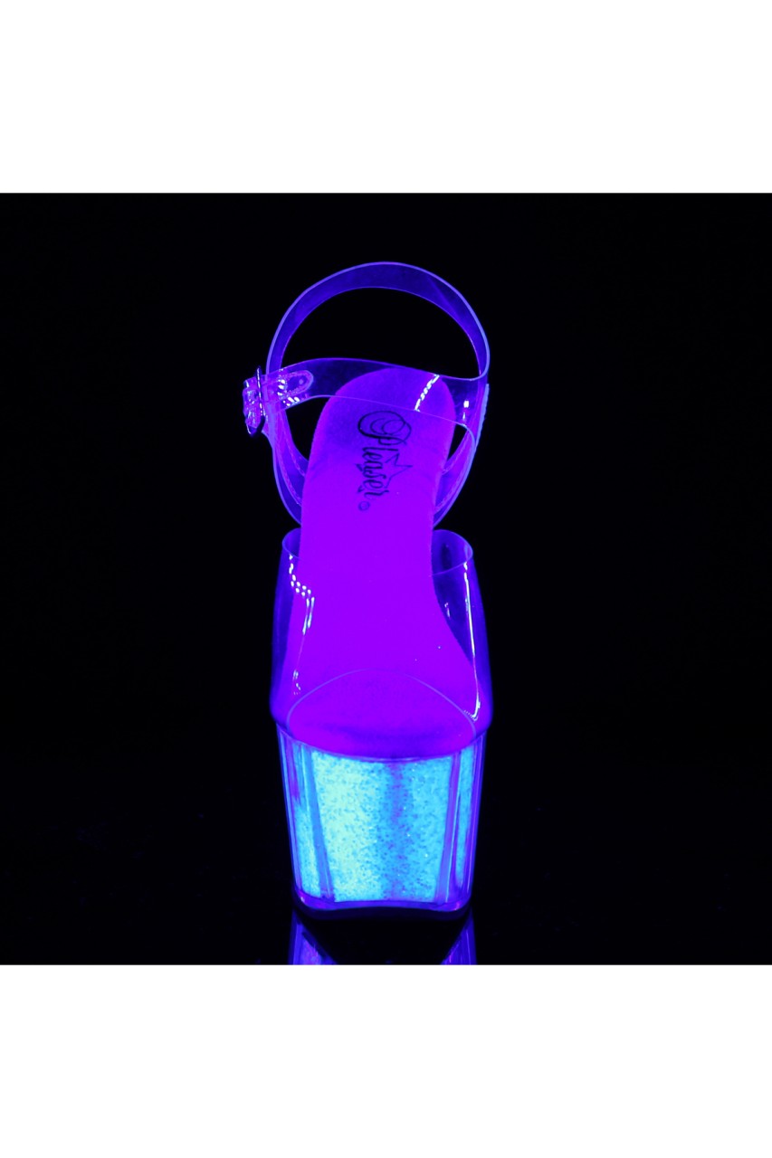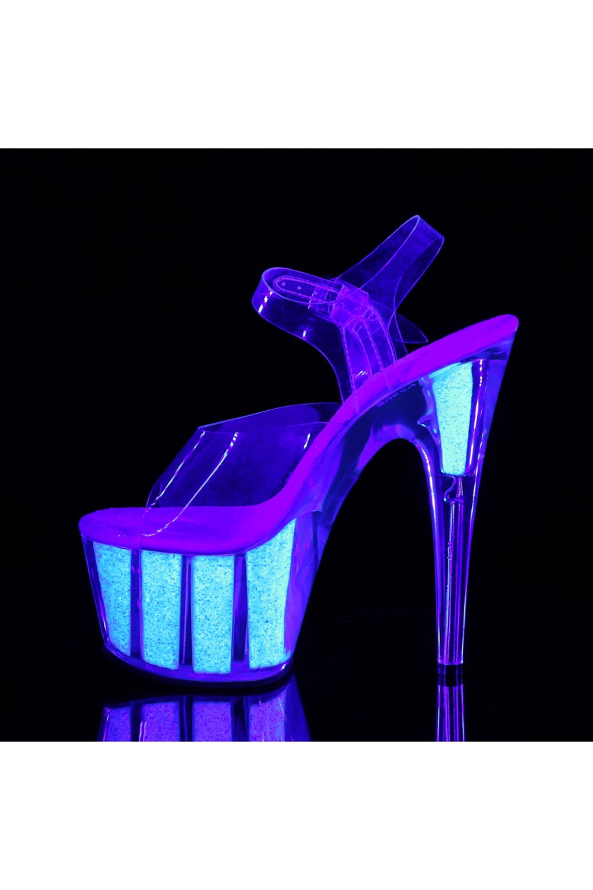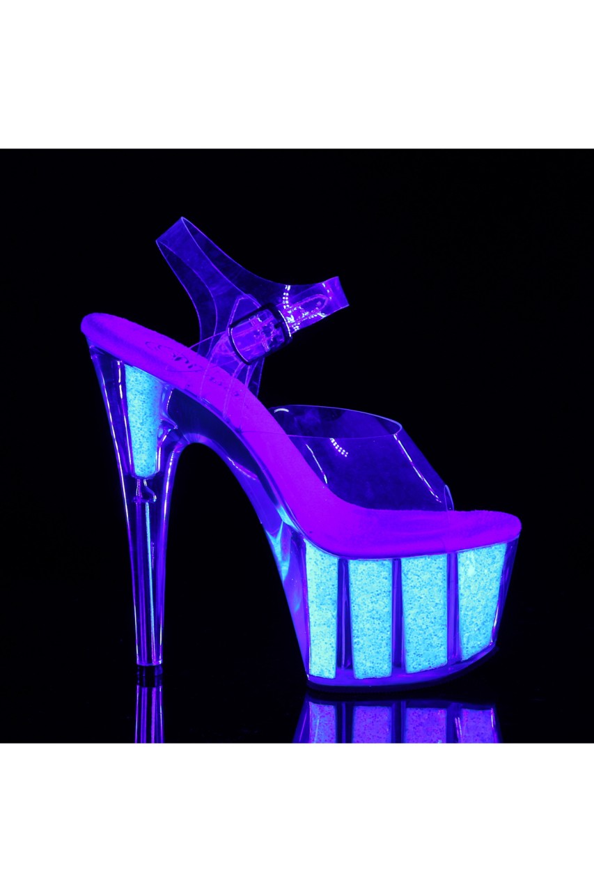 7″” (178mm) Heel, 2 3/4″” (70mm) Platform Ankle Strap Sandal w/ UV Blacklight Reactive Glitter Inserts in the Platform Bottom