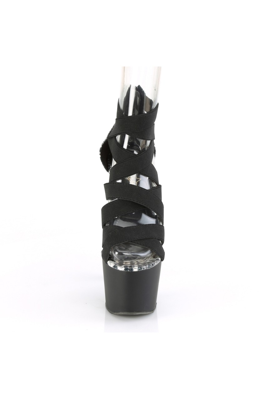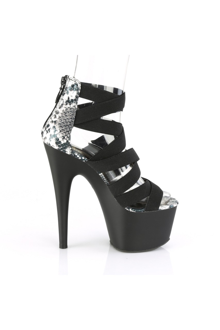 7″” (178mm) Heel, 2 3/4″” (70mm) Platform Close Back Sandal w/ Multiple Criss Cross Elastic Straps, Back Zip Closure