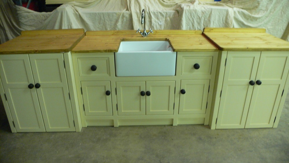This large symmetrical Belfast sink unit can house two freestanding appliances such as dishwashers, freezers etc and has a lovely inset sink area, with plenty of cupboard space too. Handpainted in farrow and ball 'ringwold ground' with the 25mm Pine Worktops/ 44mm up stand and handles waxed with our durable waterproof wax.