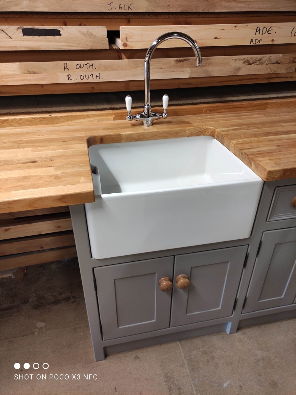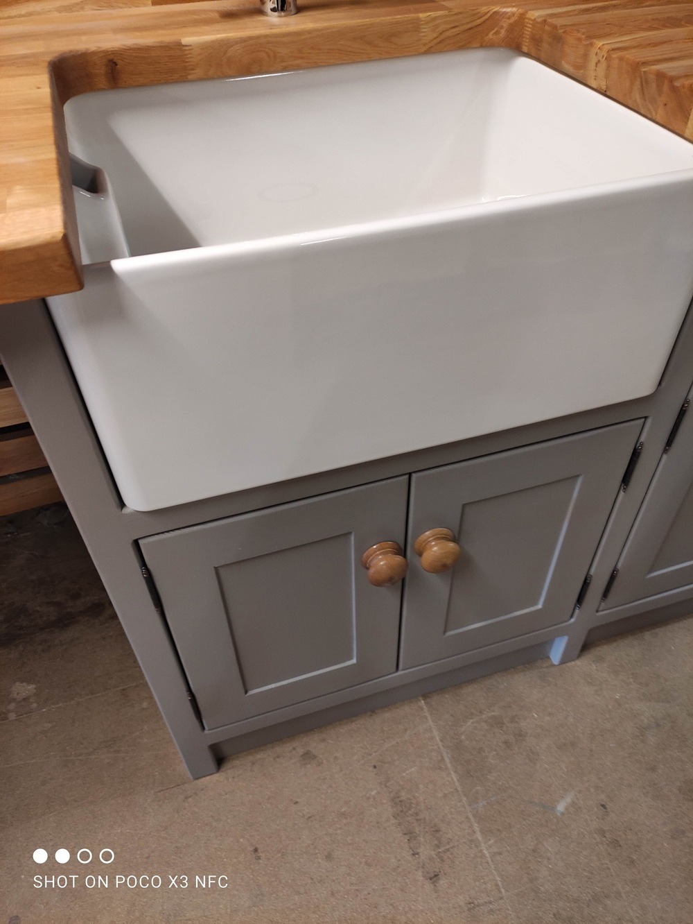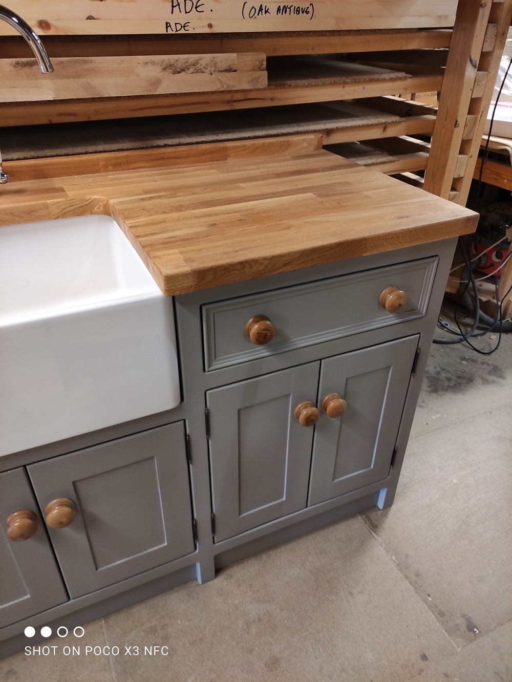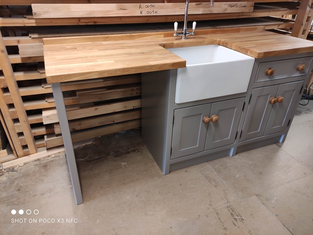 Freestanding belfast sink/appliance unit. The olive branch, Wetherby **proud to be manufacturing in Britain**. Handmade/handpainted freestanding and fitted kitchens made in our wetherby workshop from solid wood (softwood pine or hardwood alder). Finished in farrow and ball colour of your choice. Waxed knobs and a 25mm Pine worktop (picture shows 40mm oak upgrade). Includes 600mm reginox belfast sink and chrome lever tap.