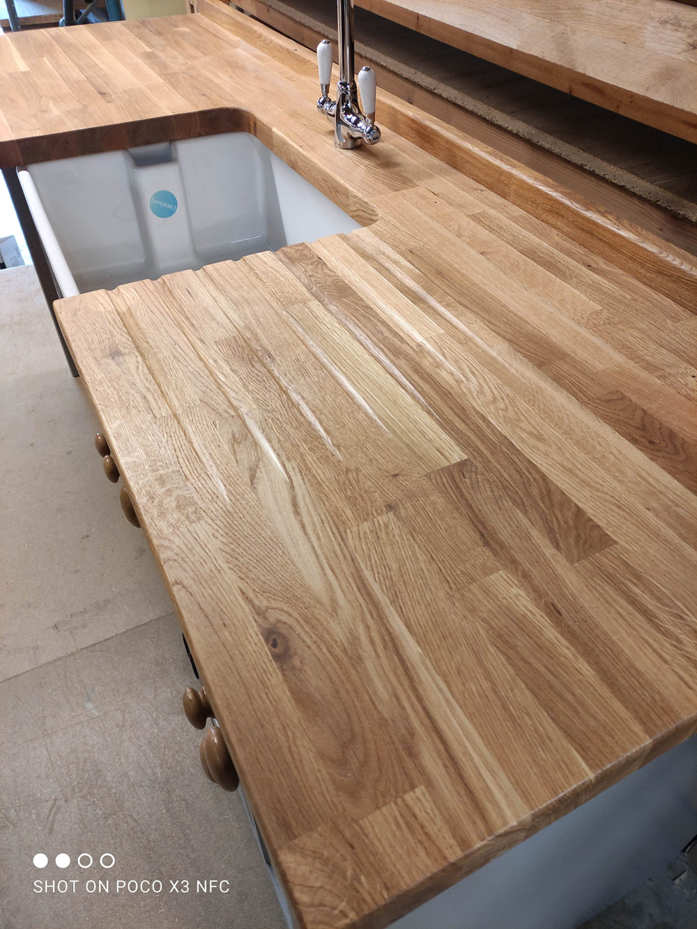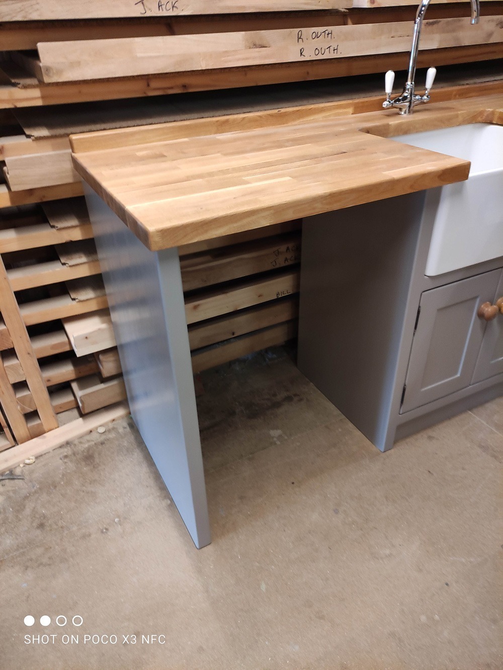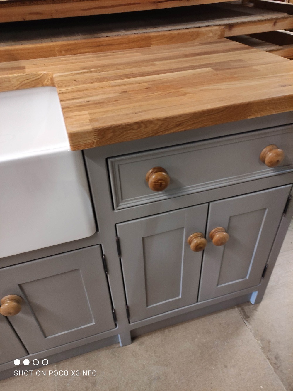 Freestanding belfast sink/appliance unit. The olive branch, Wetherby **proud to be manufacturing in Britain**. Handmade/handpainted freestanding and fitted kitchens made in our wetherby workshop from solid wood (softwood pine or hardwood alder). Finished in farrow and ball colour of your choice. Waxed knobs and a 25mm Pine worktop (picture shows 40mm oak upgrade). Includes 600mm reginox belfast sink and chrome lever tap.