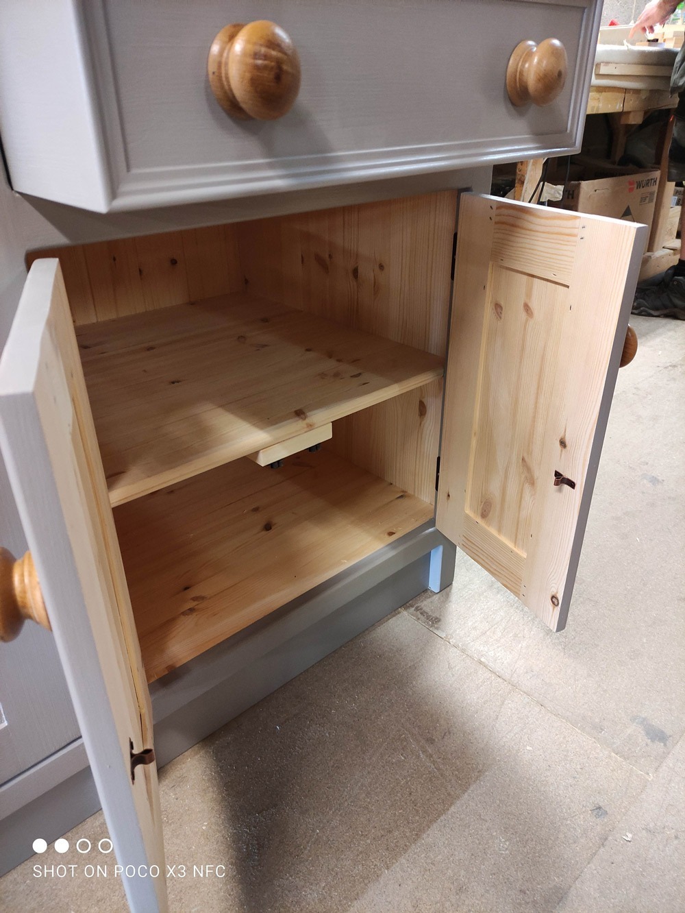 All our cabinets are made from 100% pine boards. Our worktops are available in hard wearing oak in 25mm and 40mm thicknesses. We can make worktops from composite laminate if you prefer.