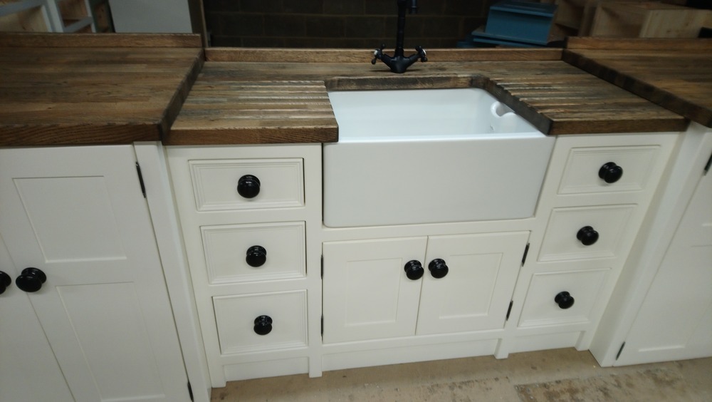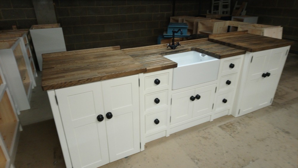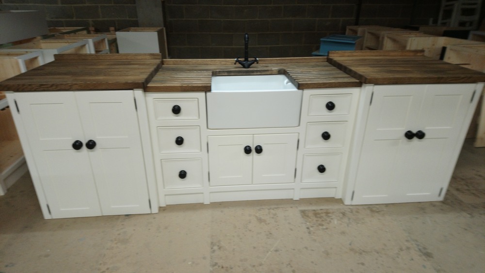 A unit with a 600mm belfast sink with a cupboard underneath- two banks of drawers. And two raised appliance housing cupboards for two standard freestanding appliances.