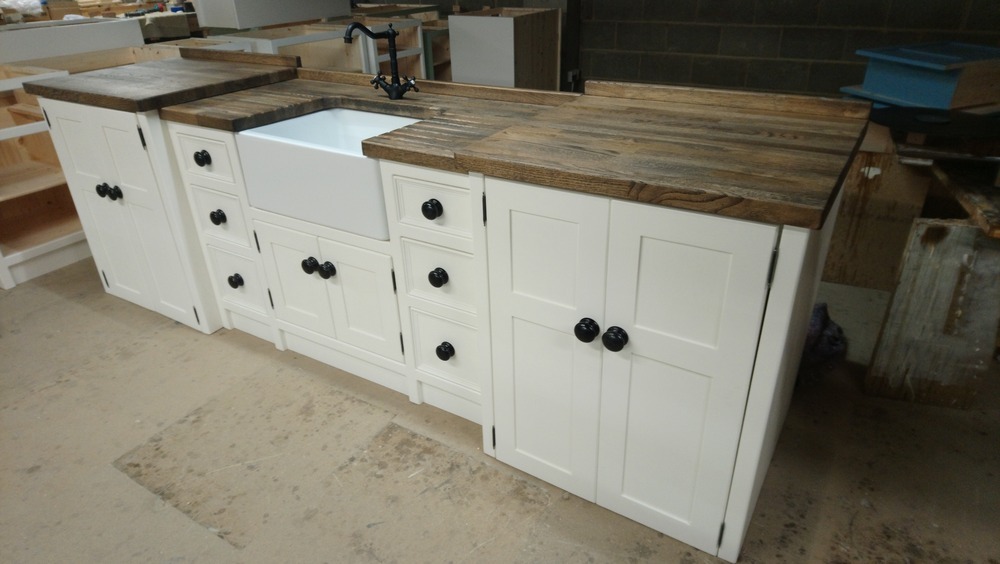 All our cabinets are made from 100% pine boards. Our worktops are available in hard wearing oak in 25mm and 40mm thicknesses. We can make worktops from composite laminate if you prefer.