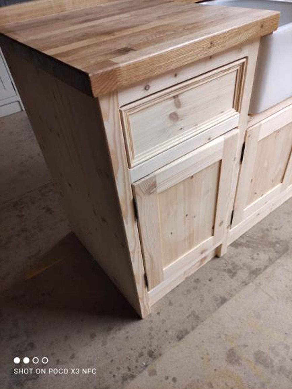 All our cabinets are made from 100% pine boards. Our worktops are available in hard wearing oak in 25mm and 40mm thicknesses. We can make worktops from composite laminate if you prefer.