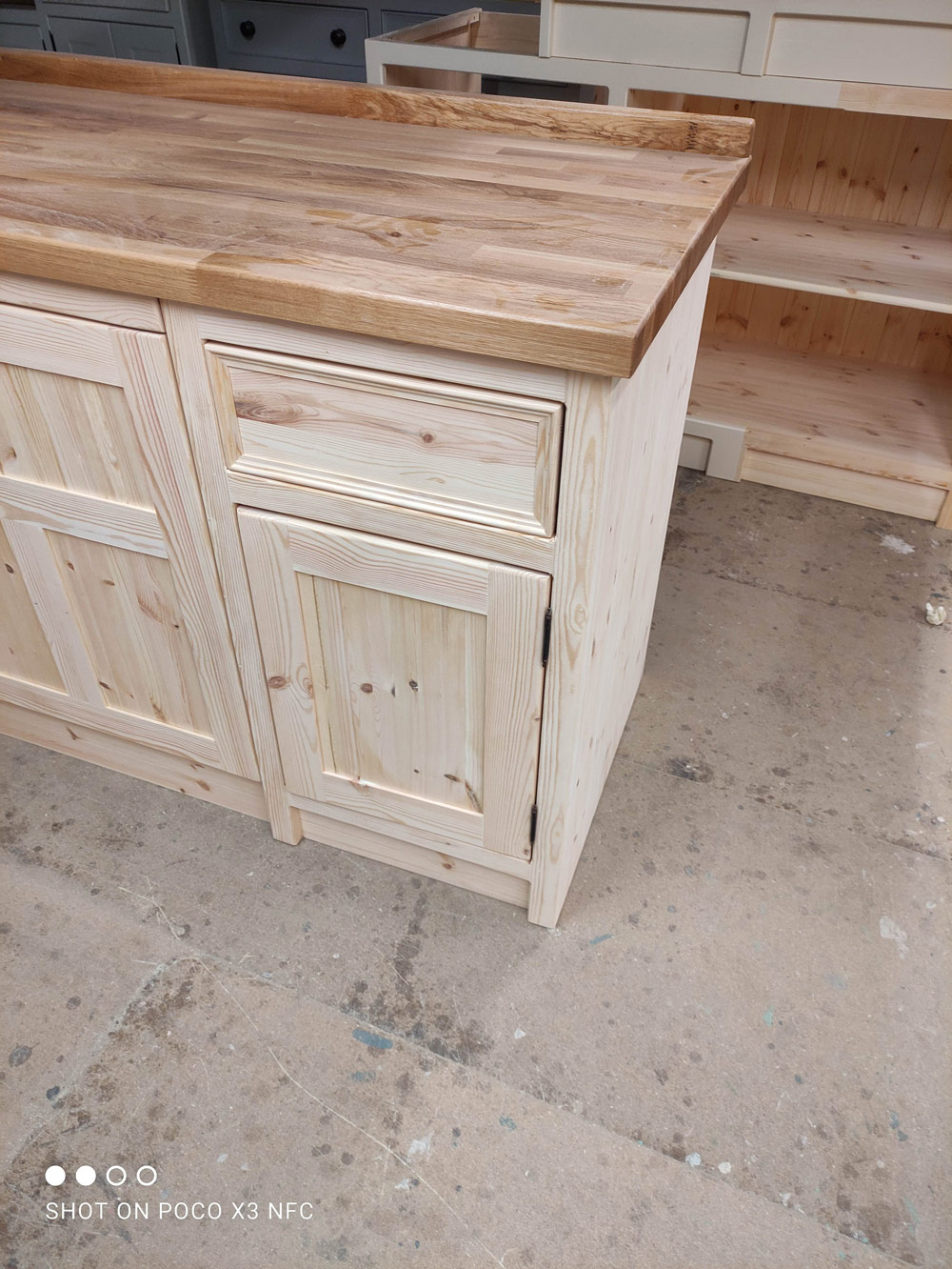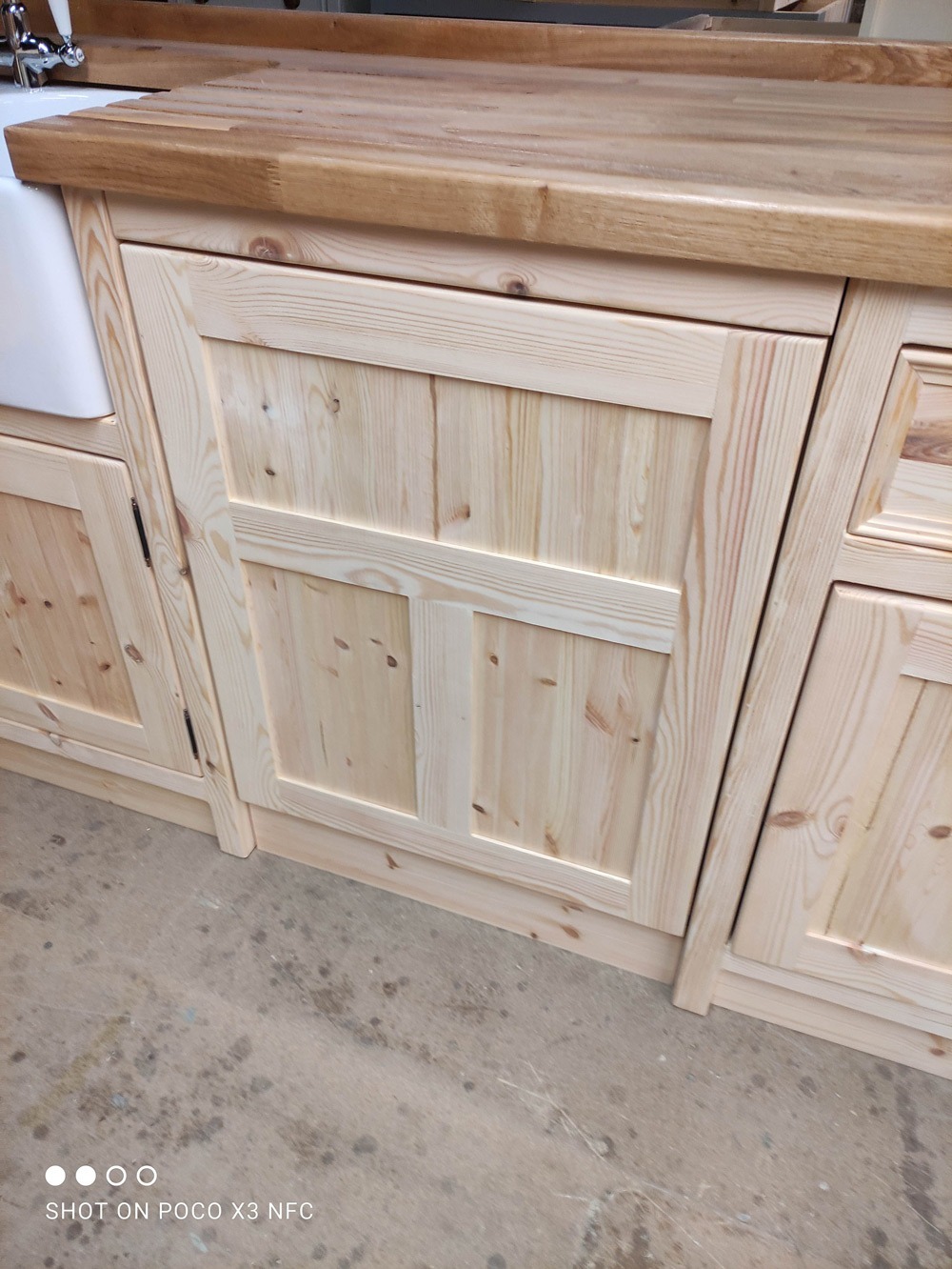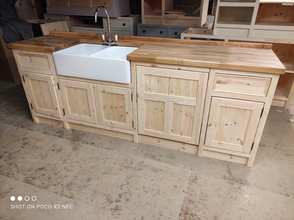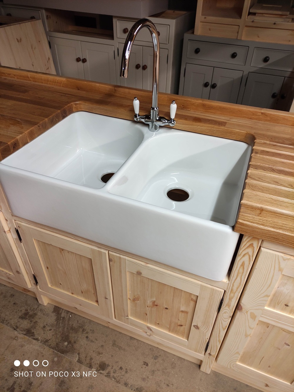 Just being built so you can choose your own paint colour. With 25mm pine worktop (please note the 40mm oak worktop is pictured). Including double 800mm ceramic belfast sink and chrome lever tap.