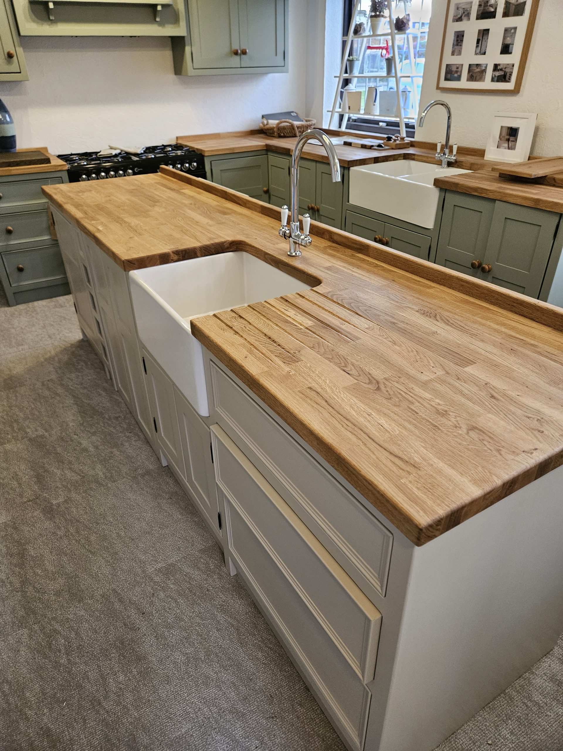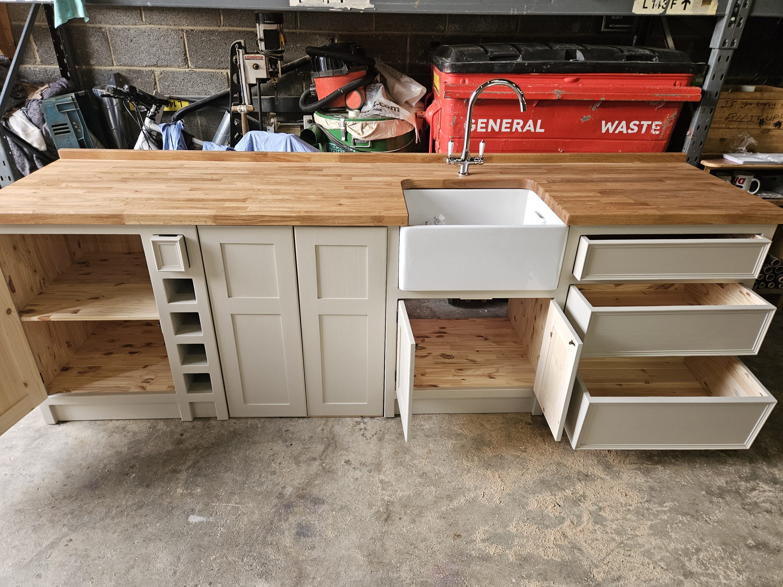 A large belfast sink unit with winrack/storage/drawers and doors to hide your freestanding appliance. This is stock so is Finished in ‘roasted macademia’ with ebonised knobs and a 40mm oak worktop (note the 40mm oak worktop is pictured)