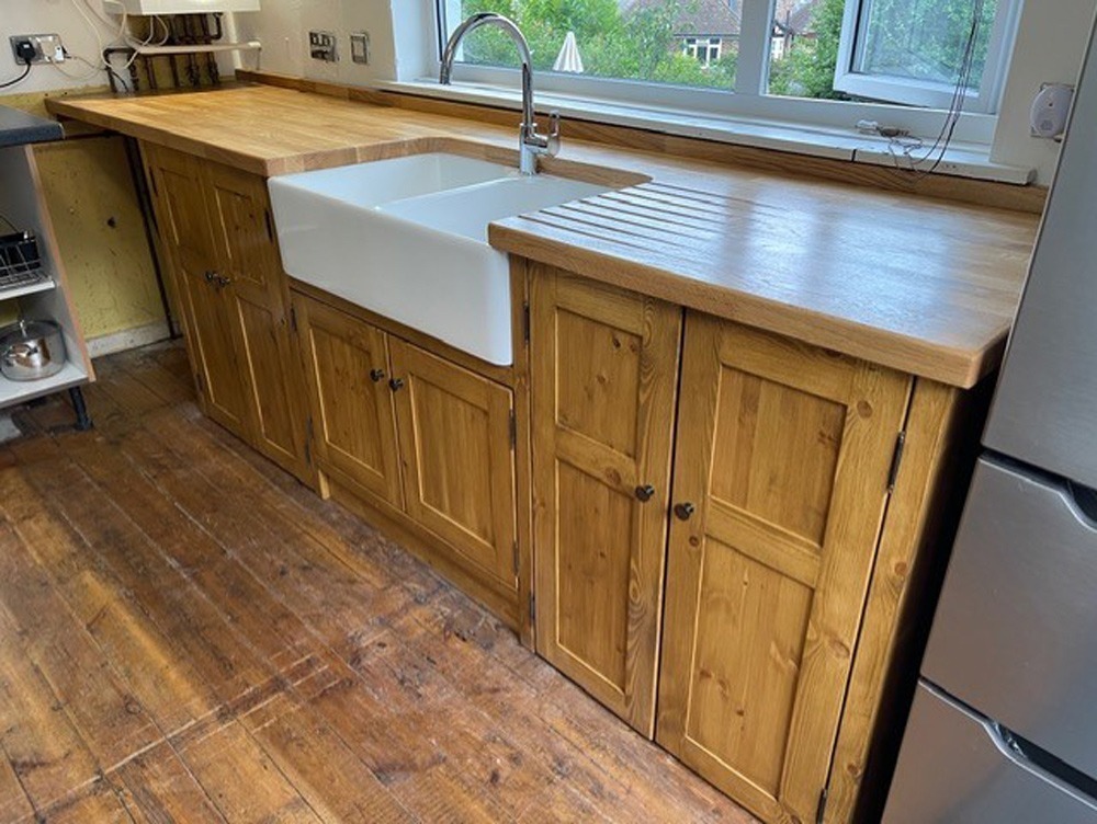 All our cabinets are made from 100% pine boards. Our worktops are available in hard wearing oak in 25mm and 40mm thicknesses. We can make worktops from composite laminate if you prefer.