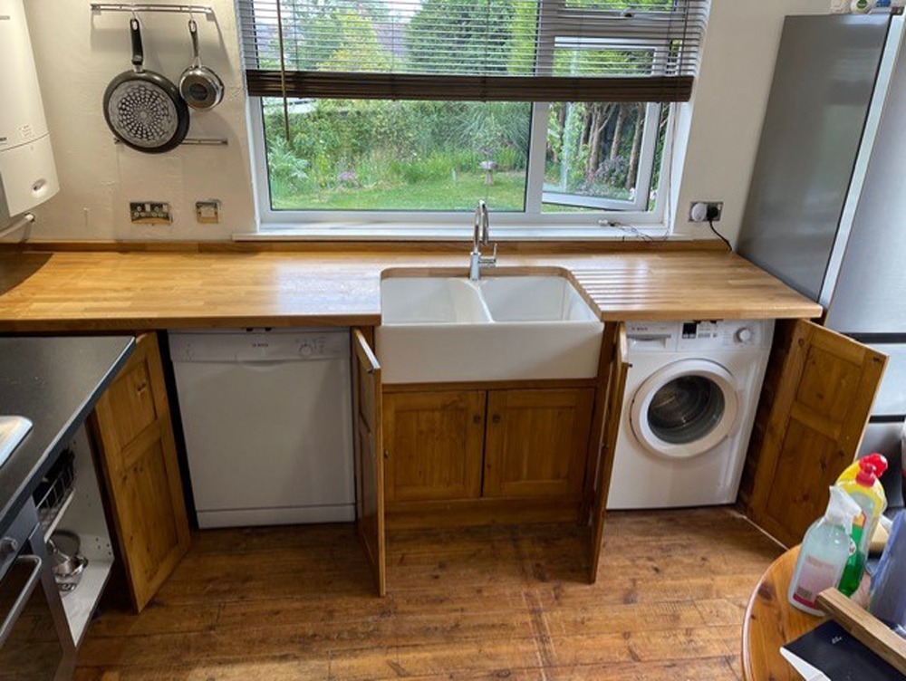 This unit consists of two appliance housing spaces for your freestanding appliances, a cupboard under the Belfast sink, and 620mm of worktop overhang.