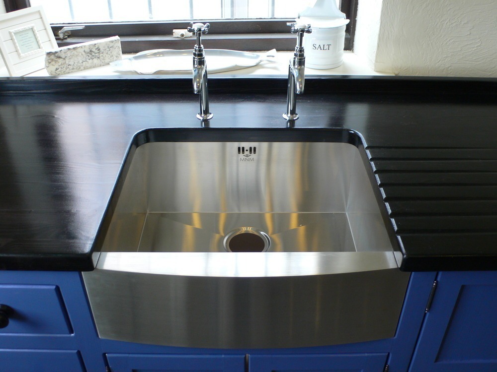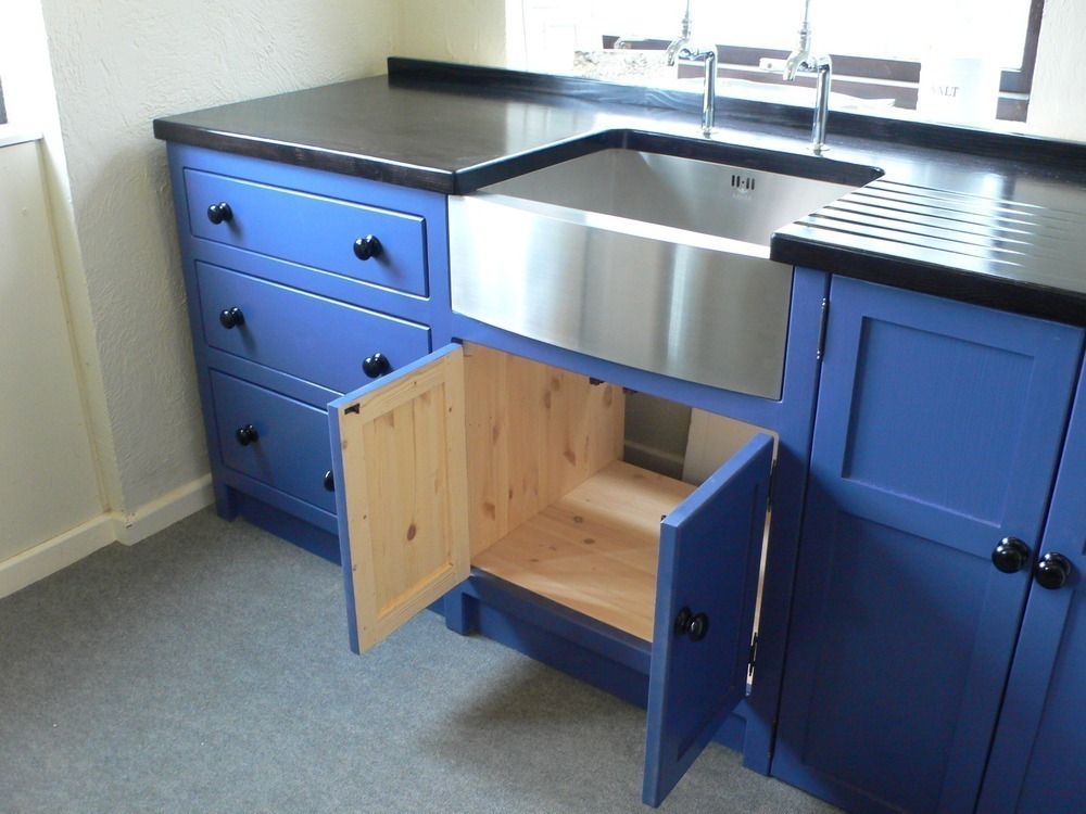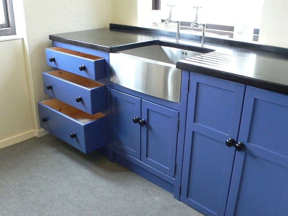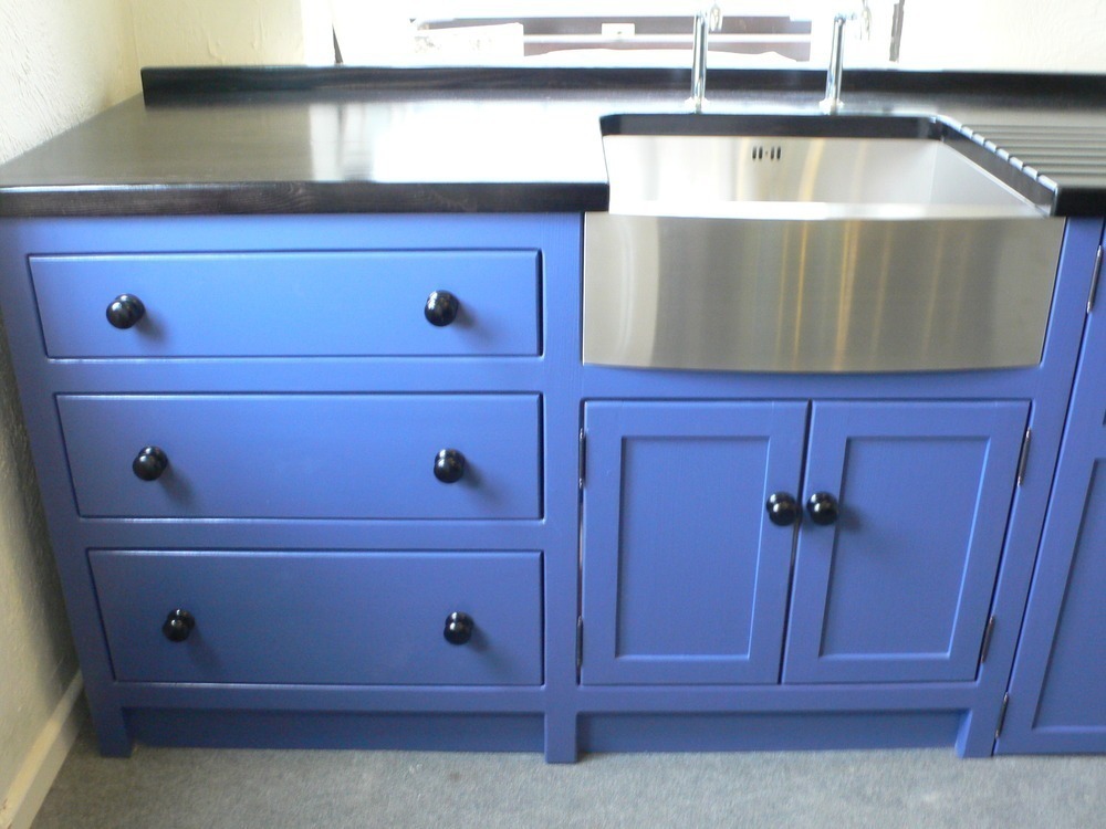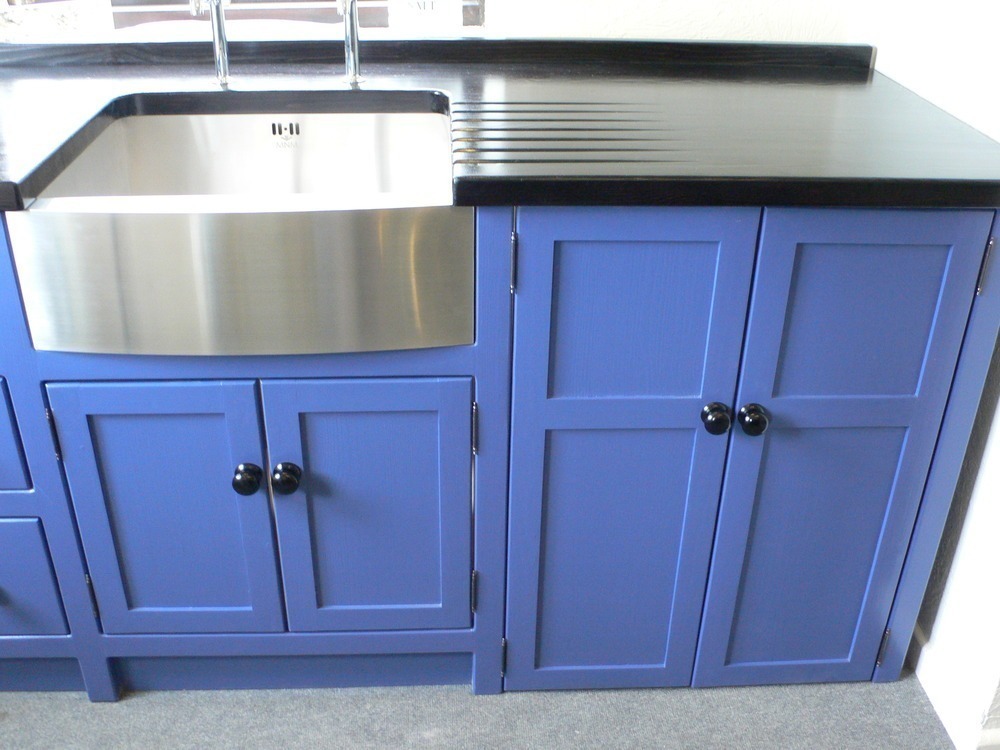 This example is finished in 'drawing room blue' with ebonised knobs (but you can choose your own colour) , 25mm ebonised black Pine Worktop (40mm oak worktop upgrade is pictured) , Stainless steel Belfast sink and Chrome bib taps.