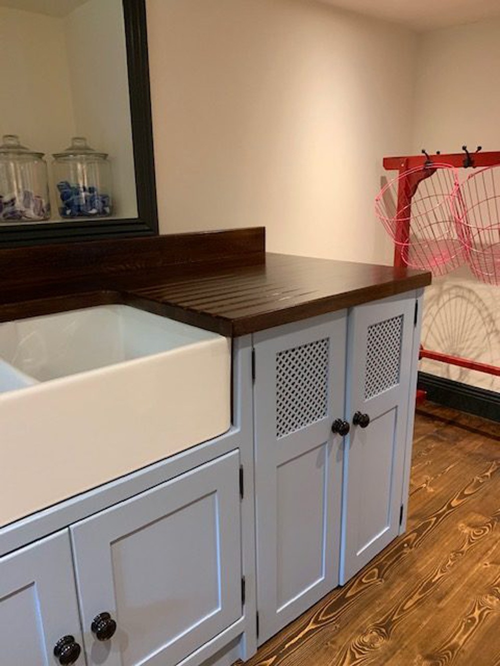 Contains housing for two freestanding appliances behind lattice work cupboard doors, a cupboard under the sink.