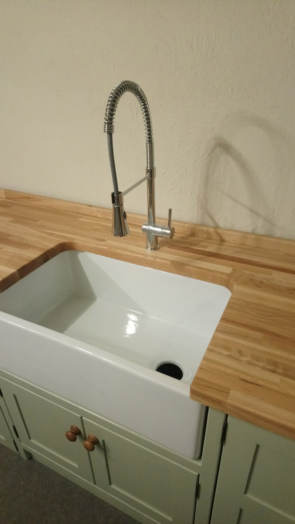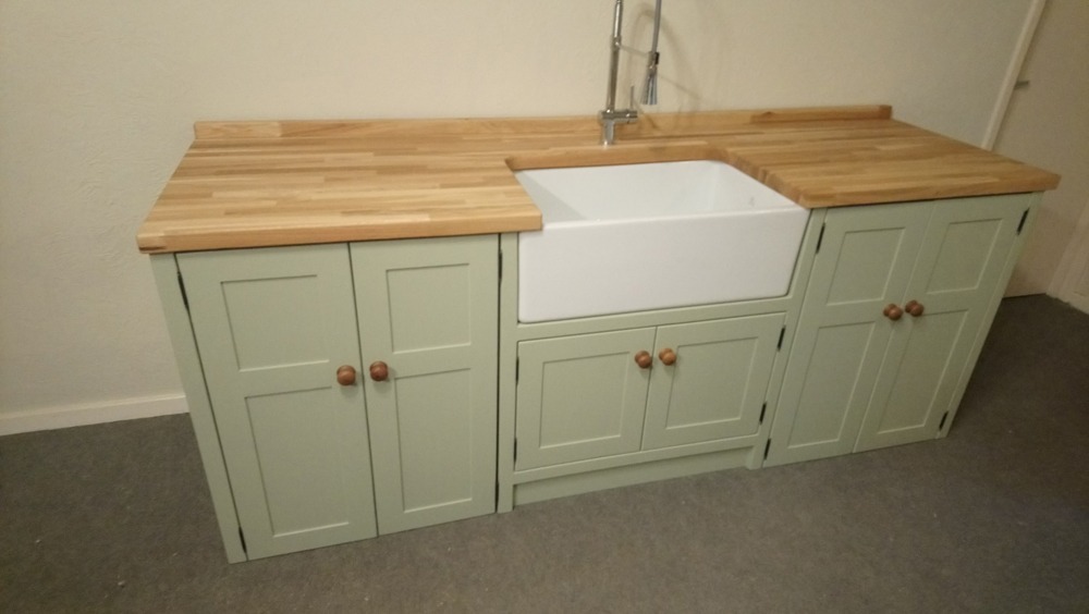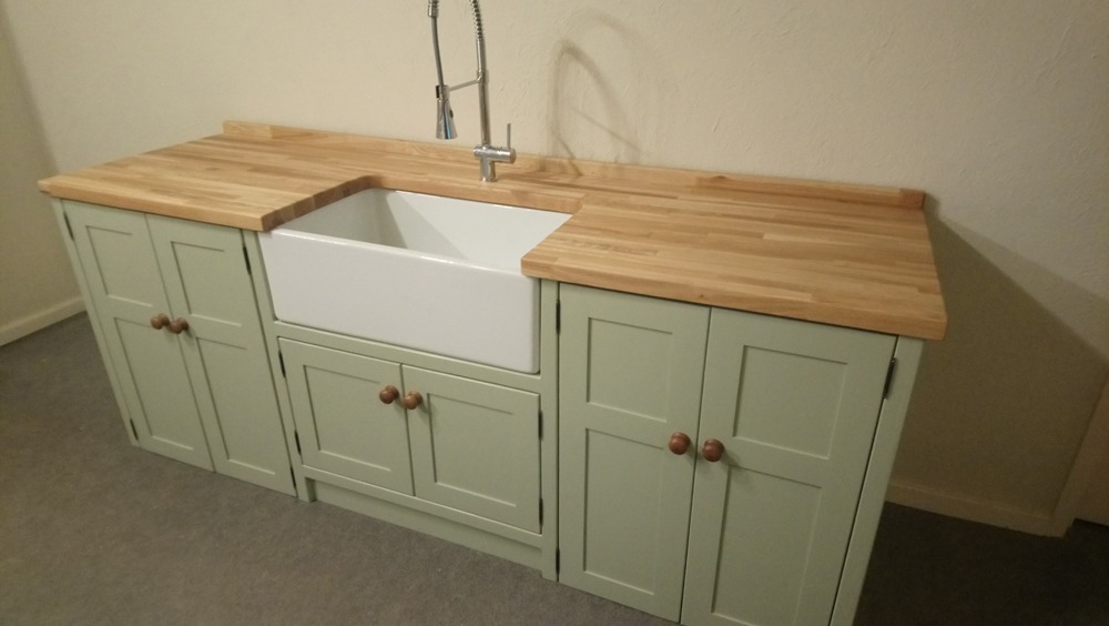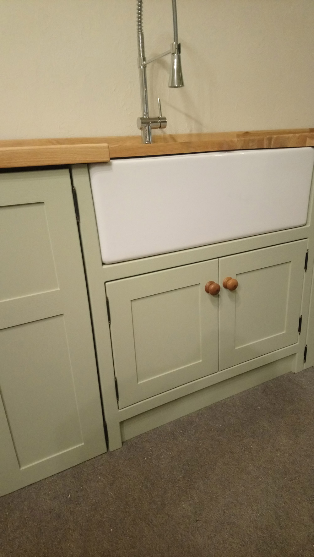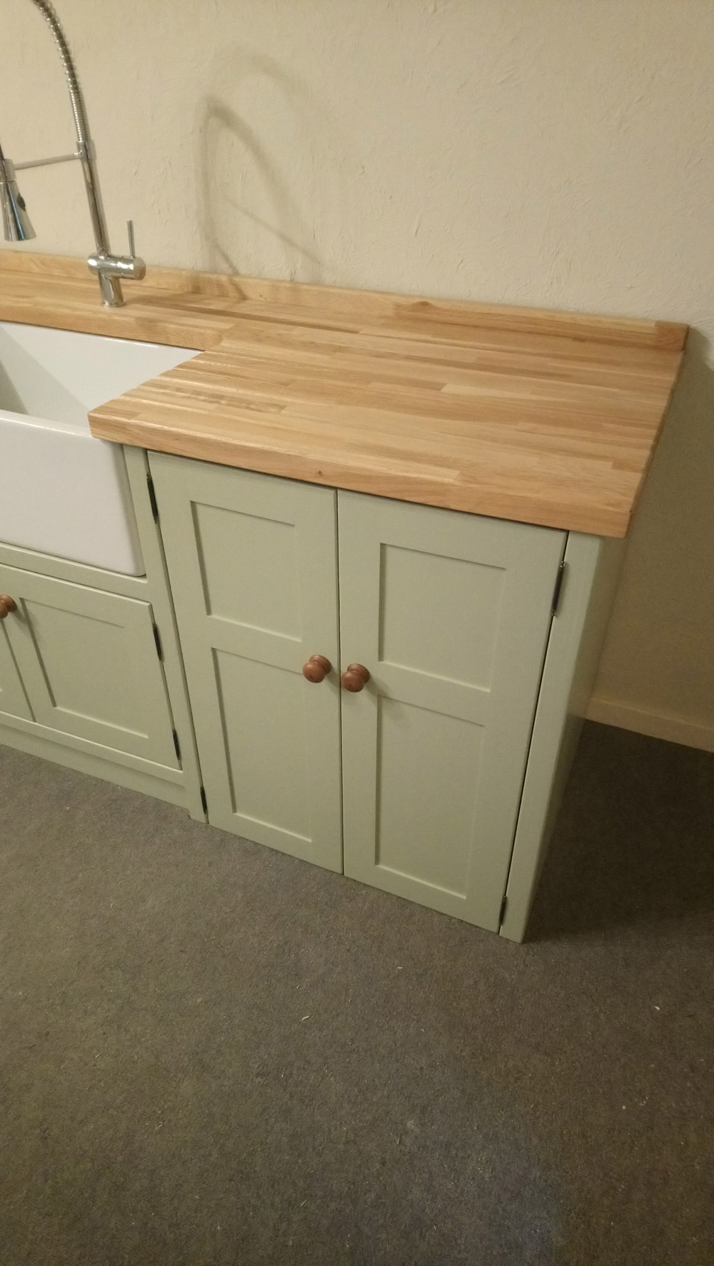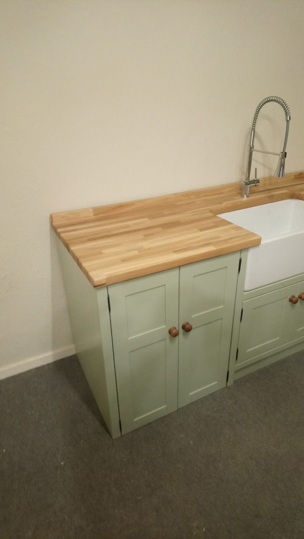 Hand painted in a farrow and ball ‘vert de terre’ with waxed knobs and 25mm Pine worktop (the 40mm oak worktop is pictured),routed drainer, all treated to be totally waterproof, with a 44mm upstand on the back