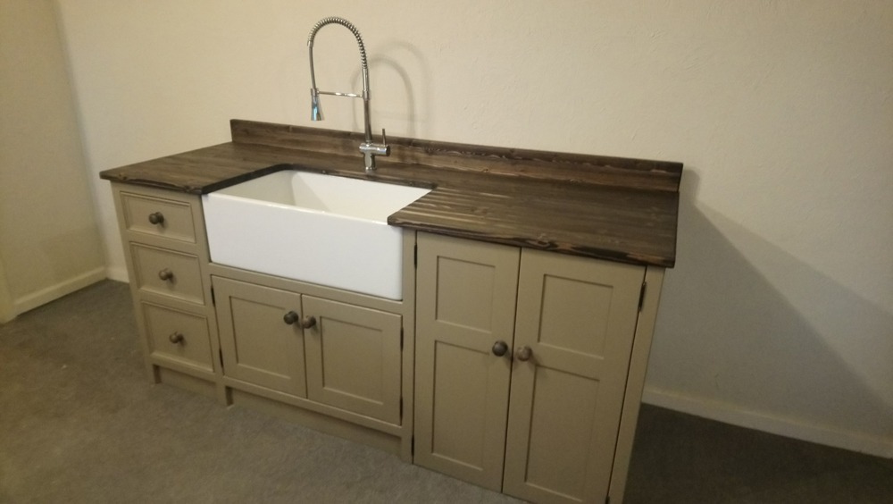 To be hand painted in a farrow and ball ‘colour of your choice’ with knobs-waxed, ebonised or painted and 25mm Pine worktop stained in graphite,routed drainer, all treated to be totally waterproof,with a 44mm upstand on the back