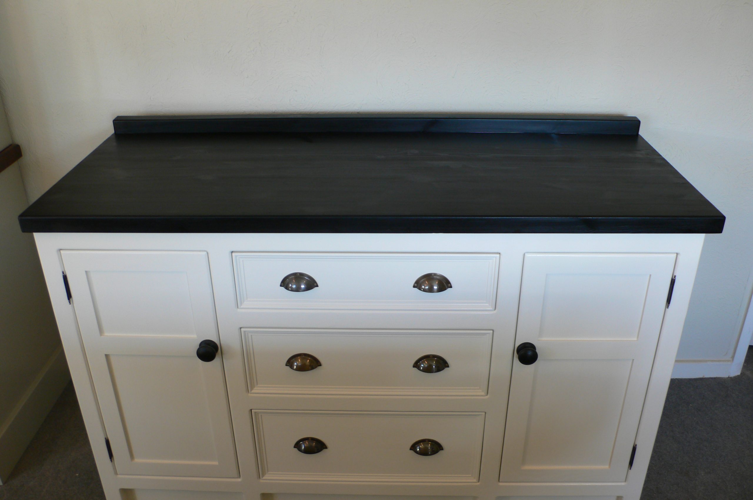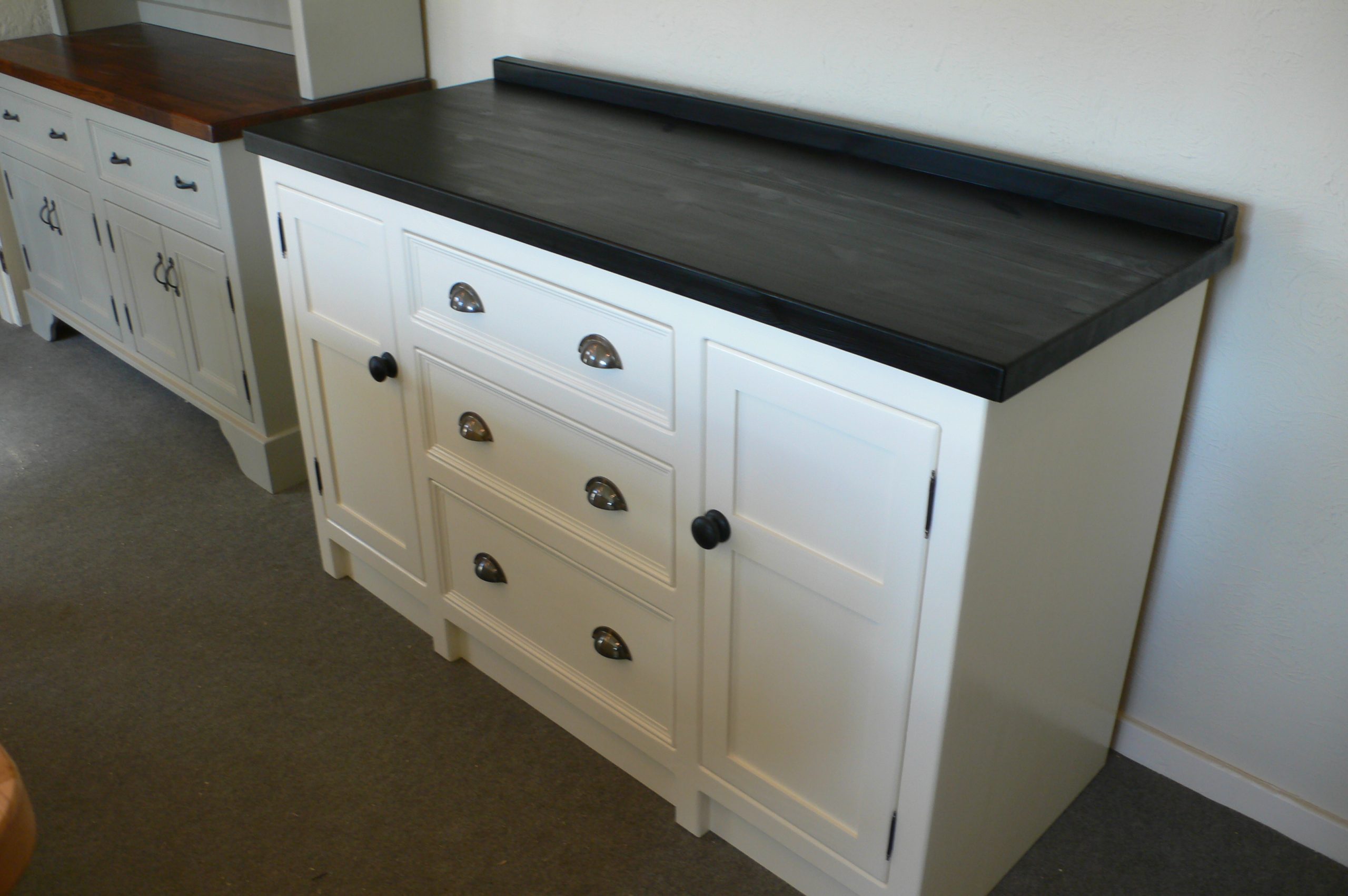This classic looking base unit gives you loads of useful storage in a set of three large beaded drawers with cup handles, with roomy cupboards either side which have ebonised knob handles. This base unit has been painted in farrow and balls ‘white tie’ with a contrasting 25mm ebonised black pine worktop, with a 25mm upstand at the back (the worktop is ebonised then treated with layers of waterproof wax to make it durable), but feel free to choose your own colour combination. Includes delivery up to 250 miles. If you wish to upgrade to an oak worktop please add £172.