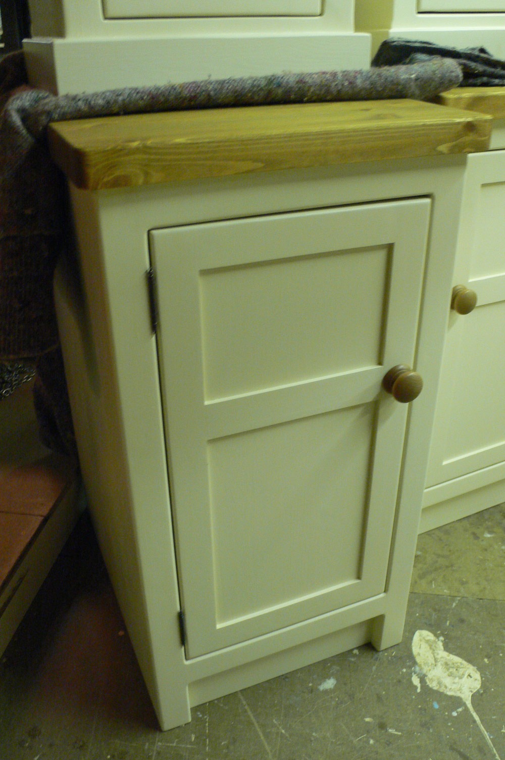 Lovely simple slim base unit easy to slot into your freestanding kitchen-giving you storage without taking up too much space. This simple small base unit has been painted in farrow and ball’s ‘ringwold ground’ and has a waxed wooden handle and a 25mm Pine worktop.Delivery is included.