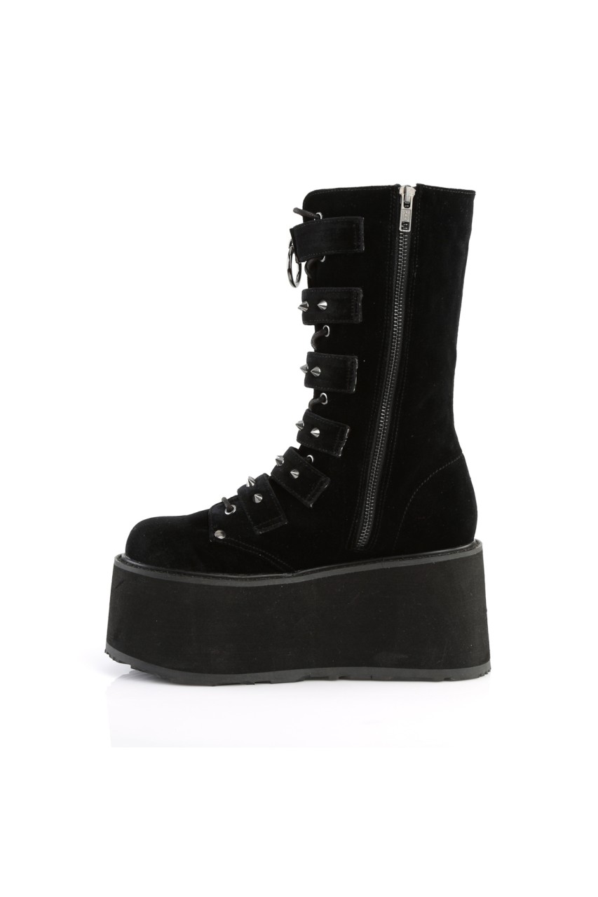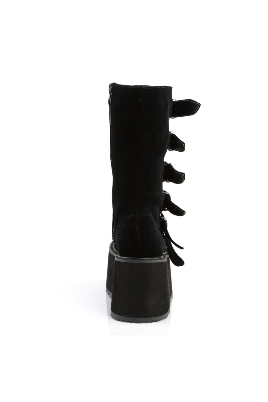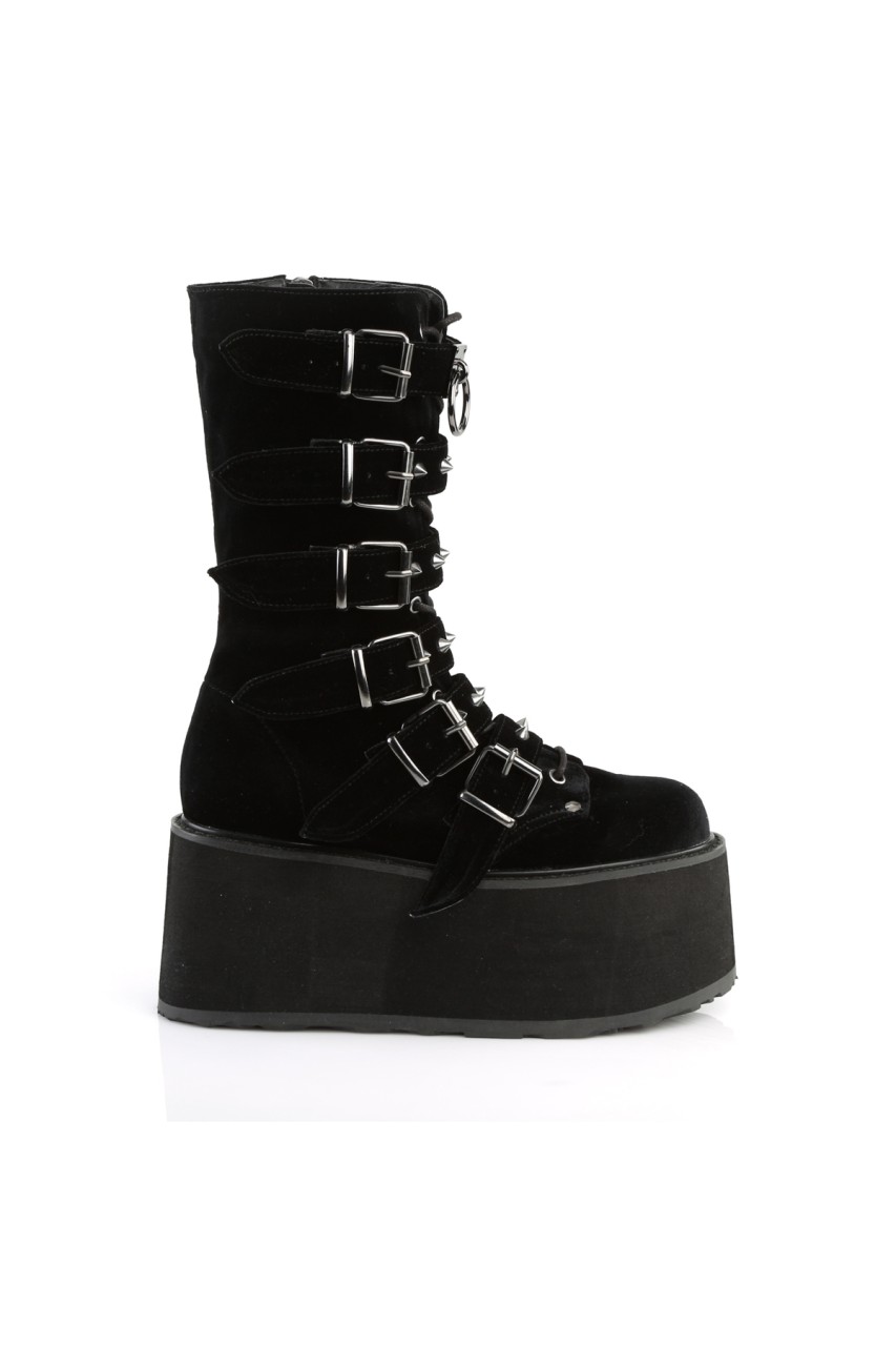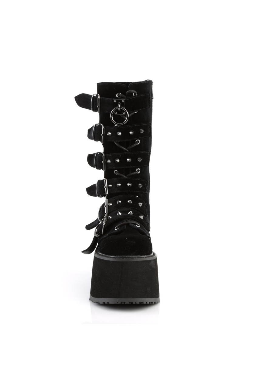 3 1/2″” (90mm) Platform Lace-Up Front Mid-Calf Boot Featuring 6 Cone-Studded Buckle Straps, Inner Side Metal Zip Closure