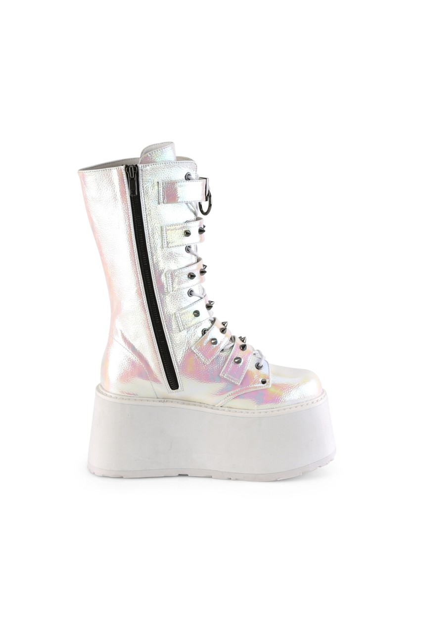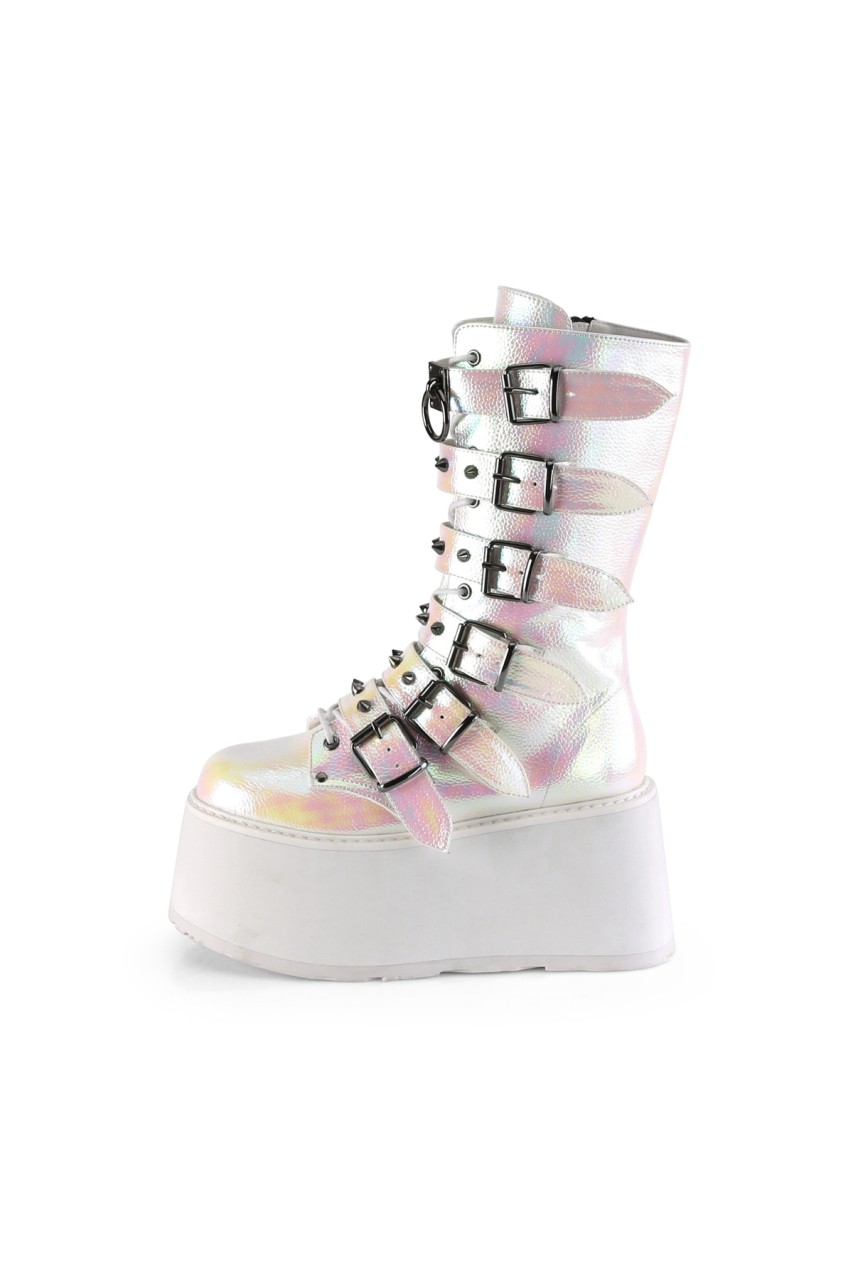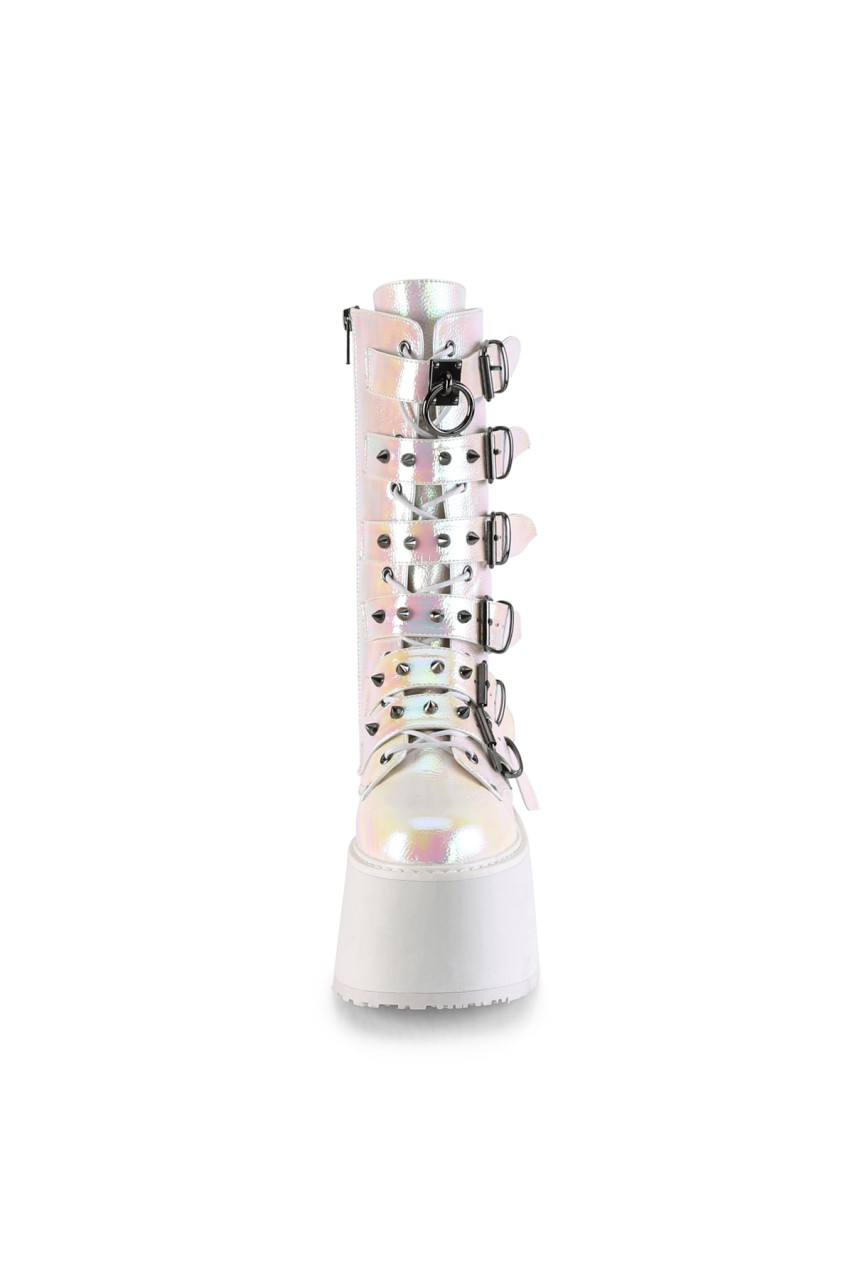 3 1/2″” (90mm) Platform Lace-Up Front Mid-Calf Boot Featuring 6 Cone-Studded Buckle Straps, Inner Side Metal Zip Closure