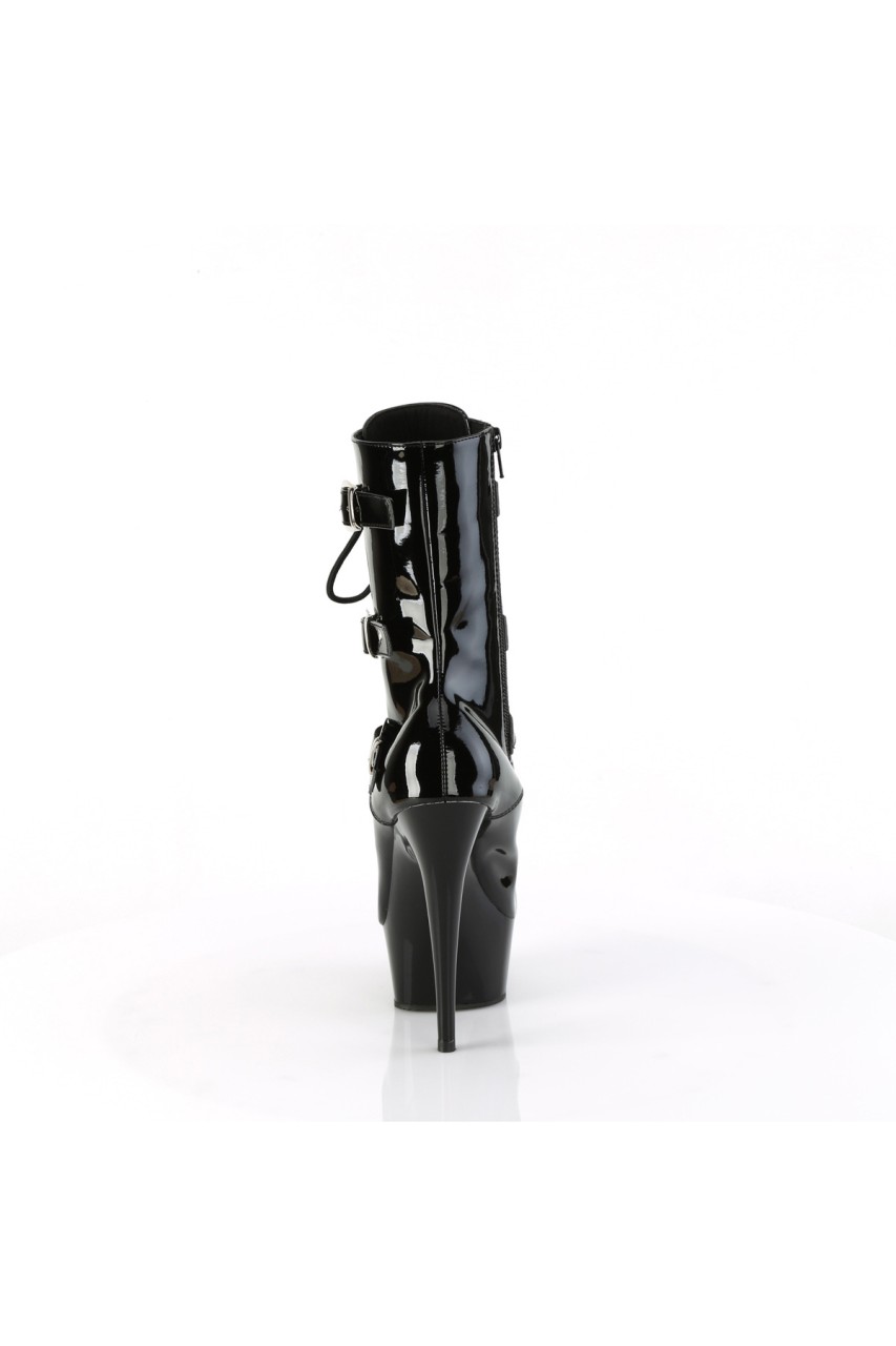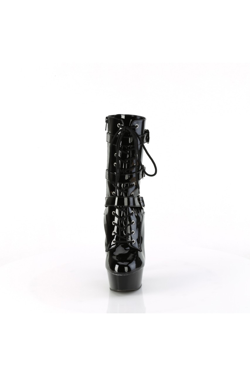 6″” (152mm) Heel, 1 3/4″” (45mm) Plaform Lace-up Front Triple Buckle Strap Mid-Calf Boot, Inner Side Zip Closure