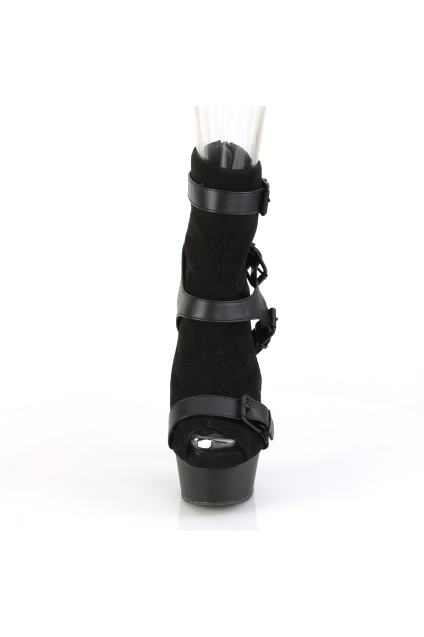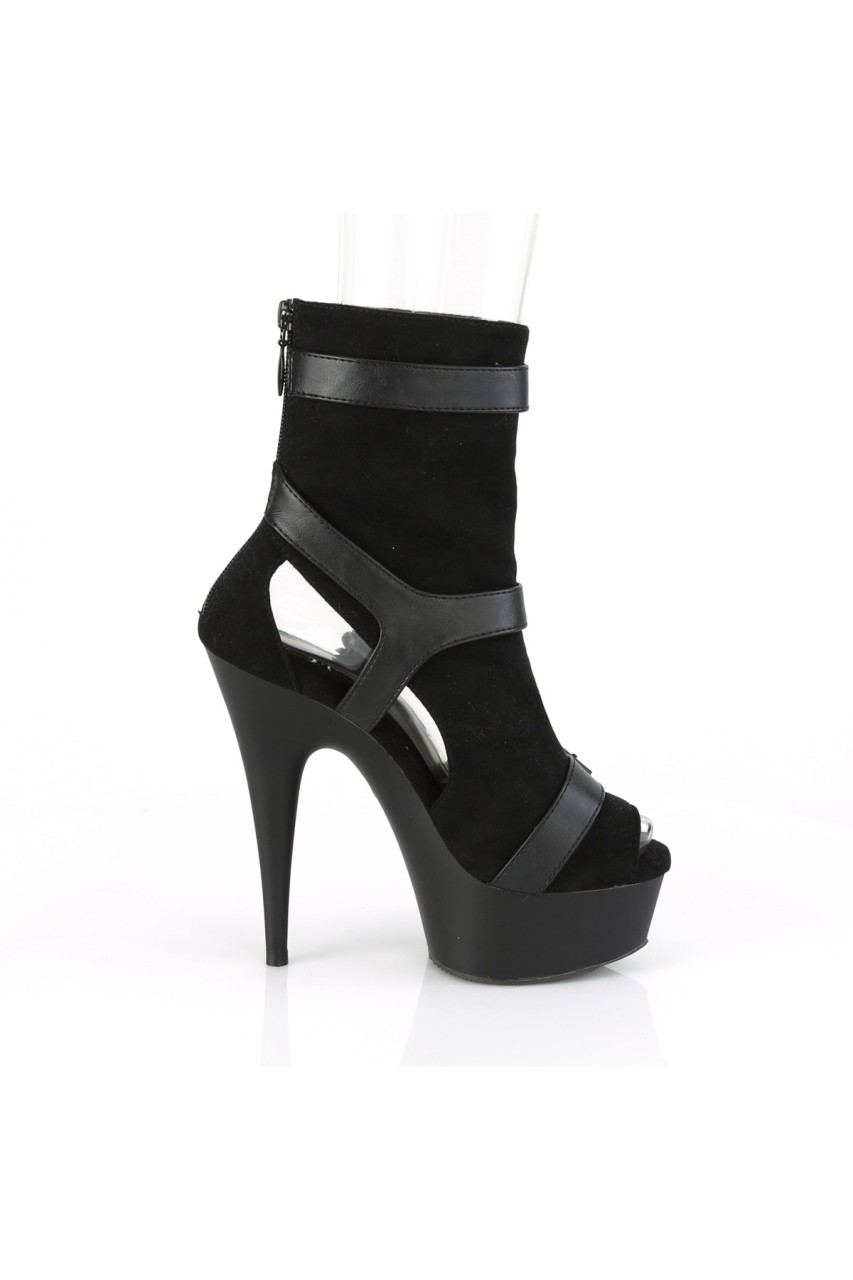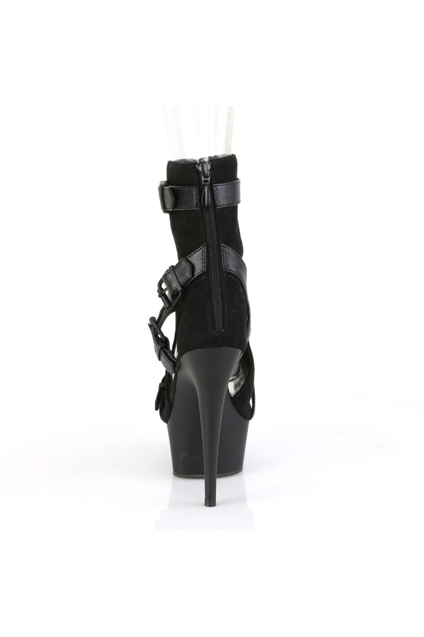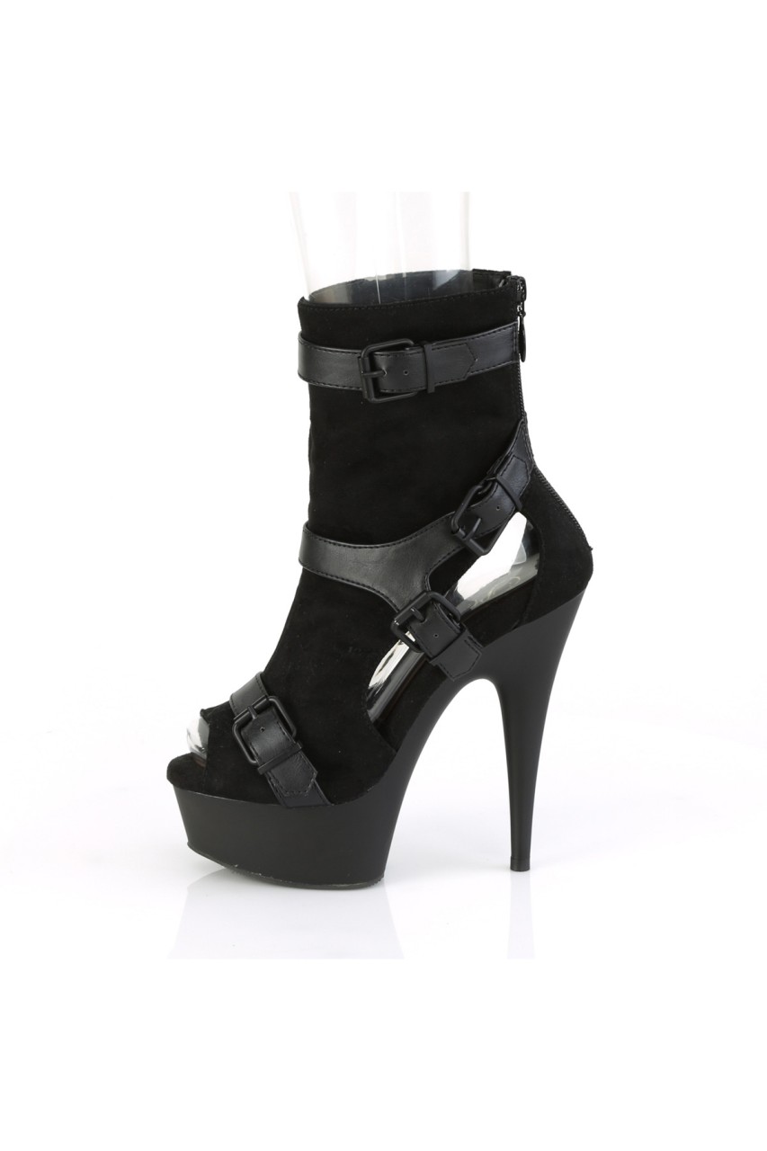 6″” (152mm) Heel, 1 3/4″” (45mm) Platform Peep Toe Ankle Boot w/Cutouts Featuring Buckle Straps Over the Vamp, Back Zip Closure