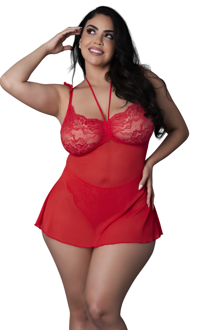 From the Sugar High collection by Magic Silk, this style includes: a sheer mesh baby doll with scalloped edge lace cups, flounce detail on shoulder straps and front spaghetti strap that ties around the neck for extra support or as a sweet front bow. Also includes a lace thong.