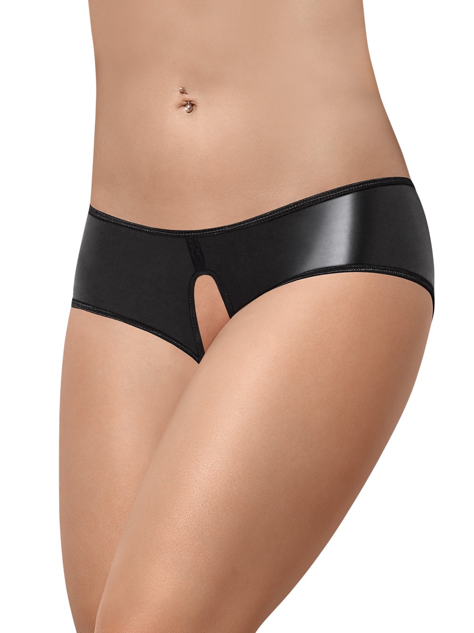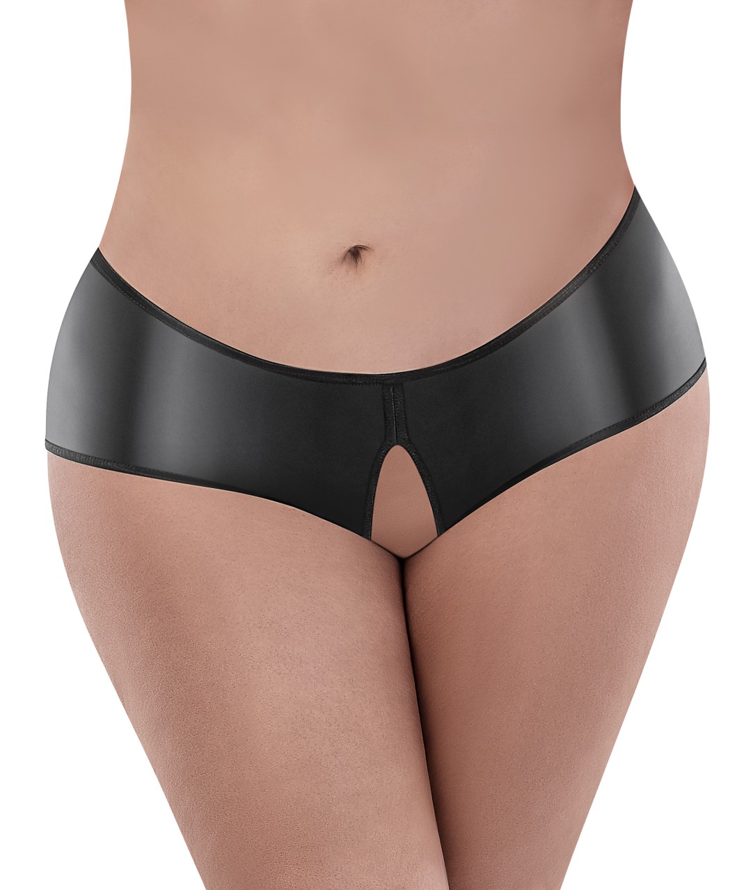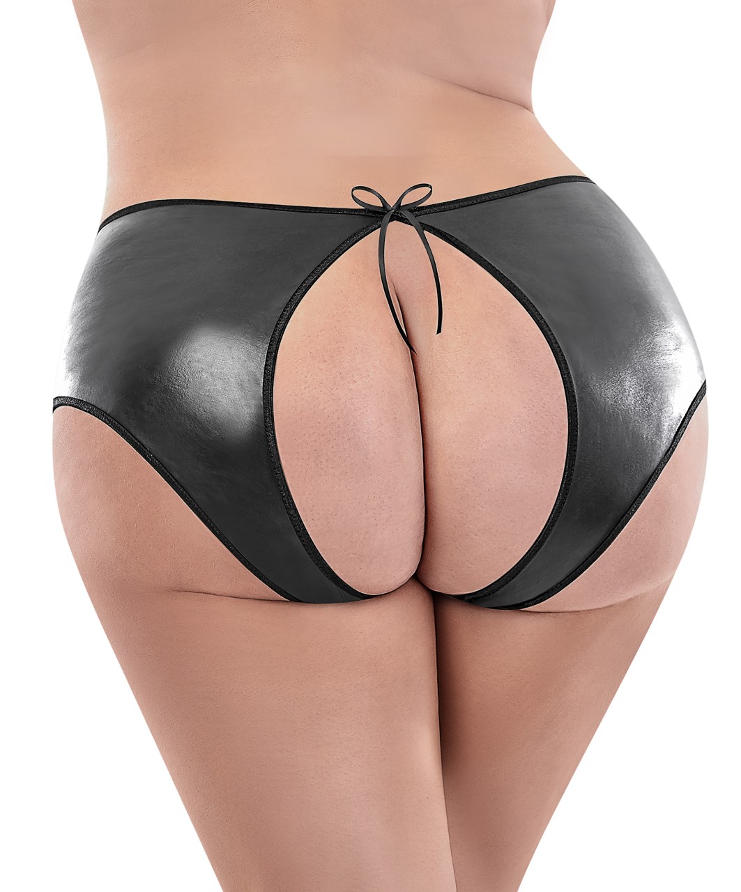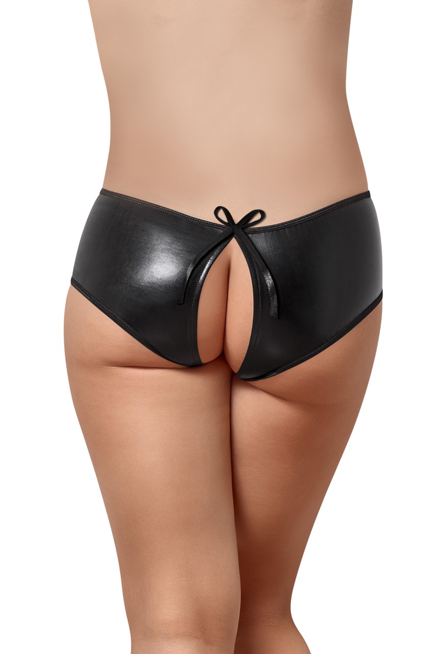 From the Split Backs by Magic Silk collection, this style includes: A split back short in wet-look black fabric with an open crotch and a satin bow accent in the front. Hand Wash Cold. No Bleach. Dry Flat. 95% Polyester, 5% Spandex