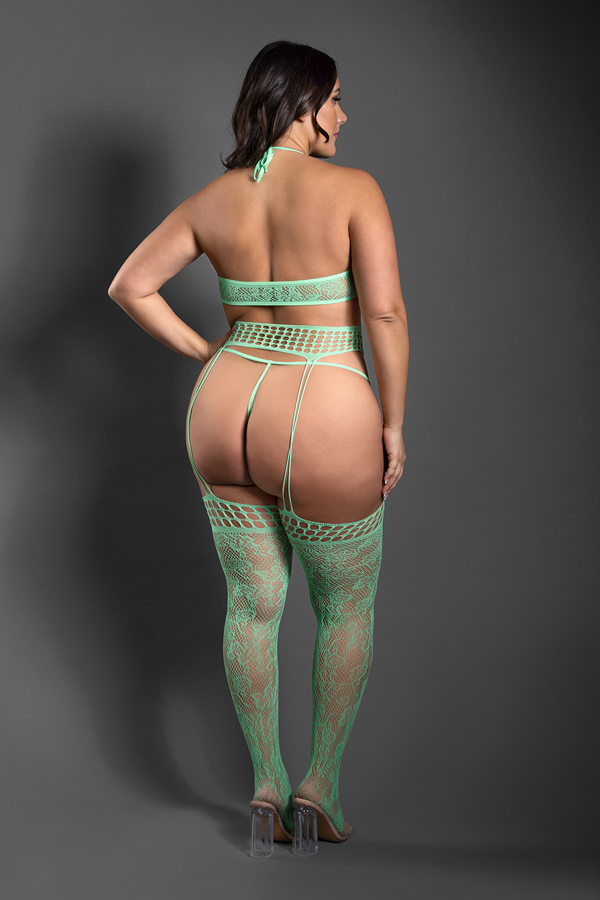 Fantasy Lingerie – HEART OF GLASS Lace knit halter tie top, g-string panty and gartered stockings – FL-SF1006