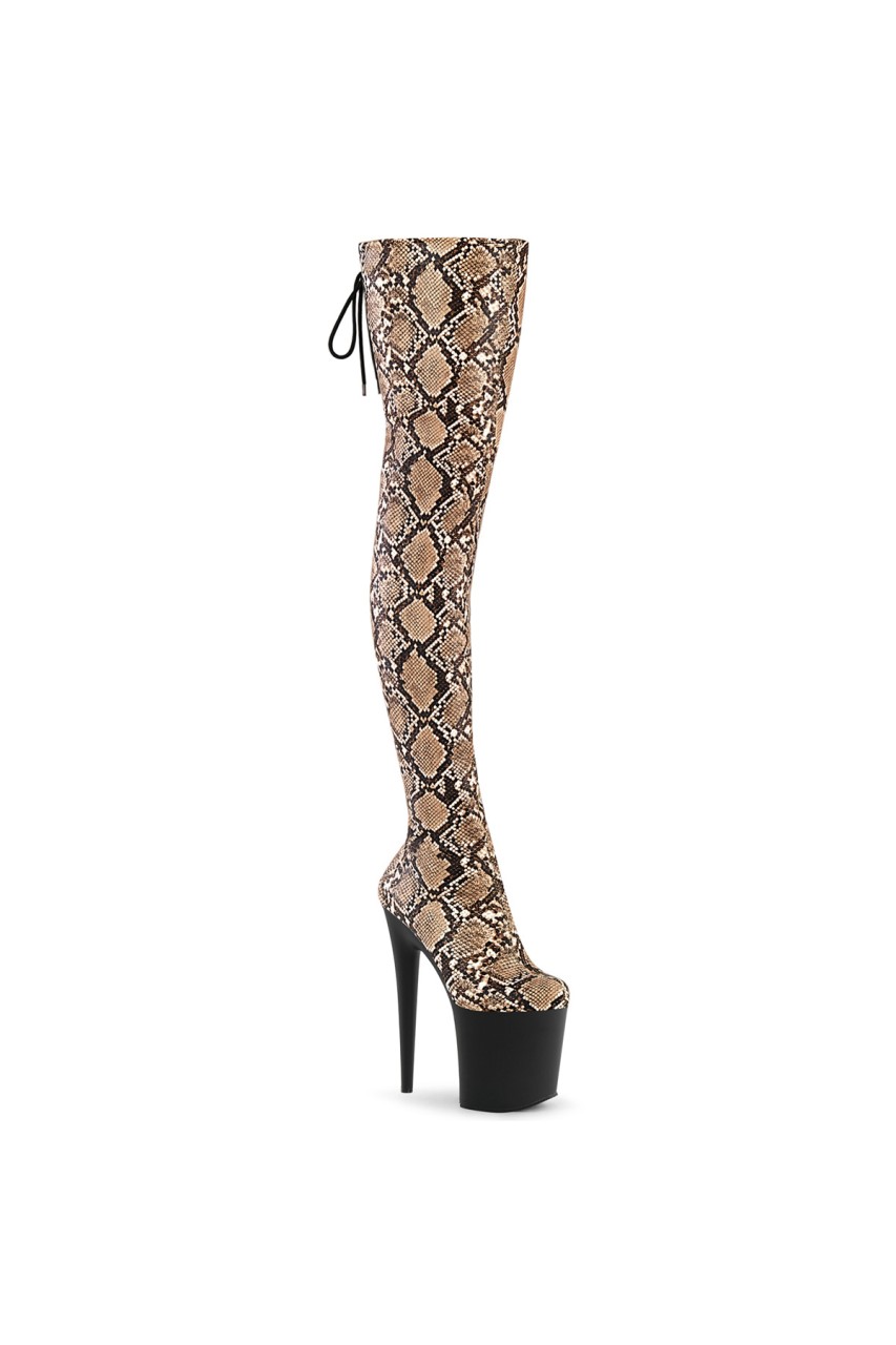 8″” (200mm) Heel, 4″” (100mm) Platform Platform Stretch Snake Print Pull-On Thigh Boot w/Rear Tie Fastening