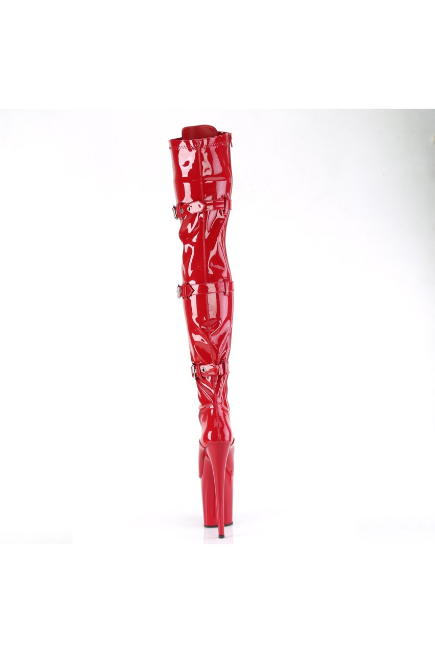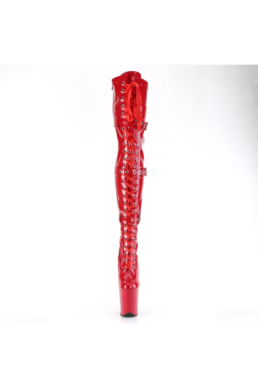 8″” (200mm) Heel, 4″” (100mm) Platform Stretch Ribbon Lace-Up Triple Buckle Thigh High Boot, Full Length Inner Side Zip Closure