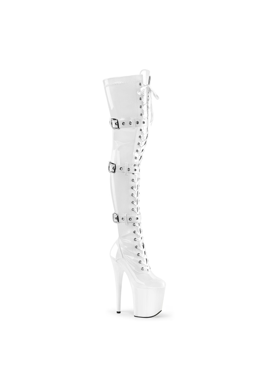 8″” (200mm) Heel, 4″” (100mm) Platform Stretch Ribbon Lace-Up Triple Buckle Thigh High Boot, Full Length Inner Side Zip Closure