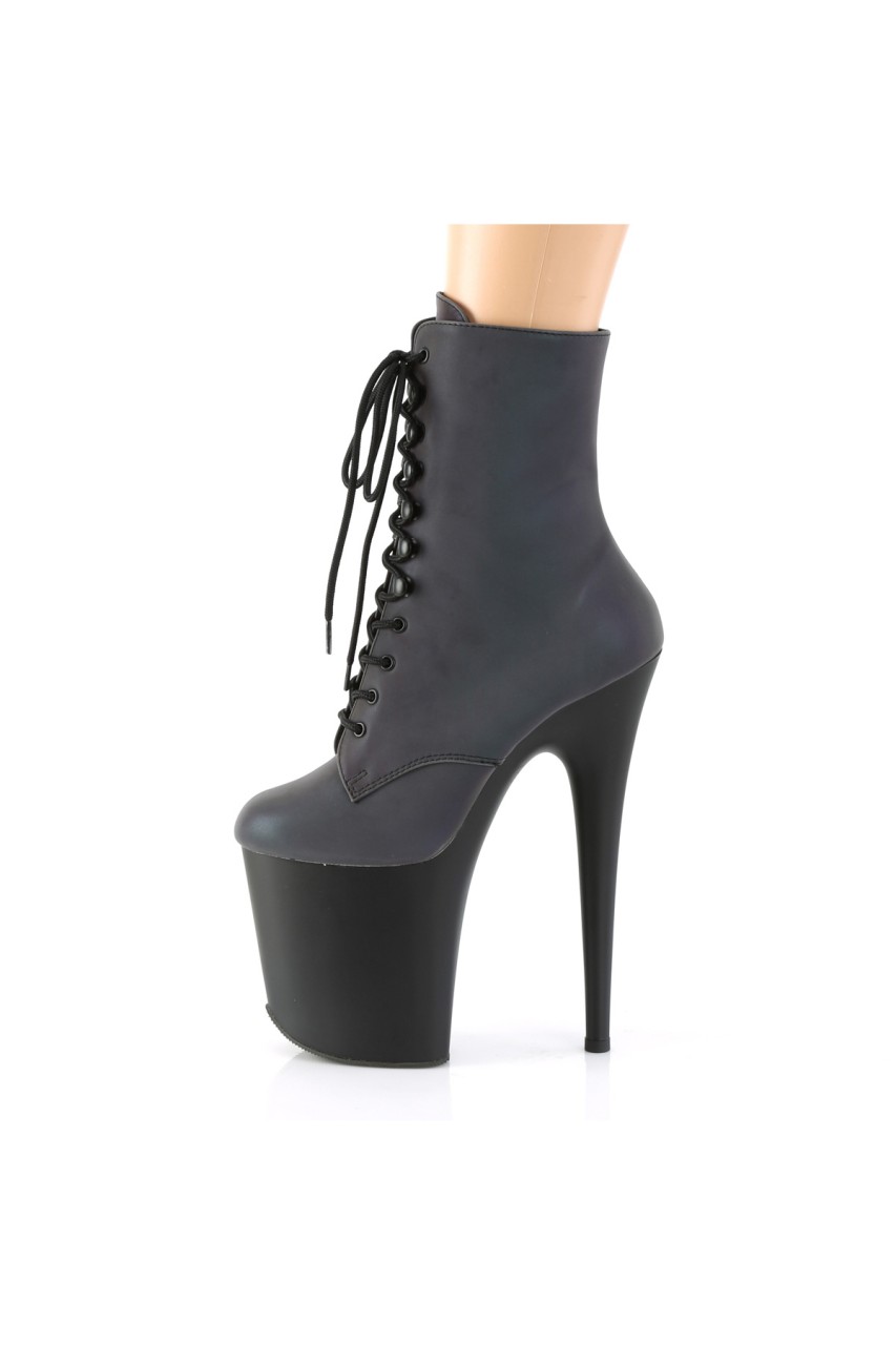 8″” (200mm) Heel, 4″” (100mm) Platform Lace-Up Front Ankle Boot Featuring Reflective Upper, Inner Side Zip Closure