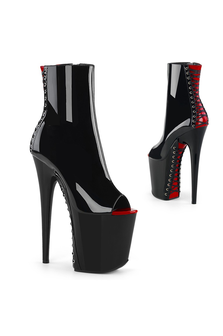 8″” (200mm) Heel, 4″” (100mm) Platform Peep Toe Corset Style Ankle Boot, Inner Side Zip Closure