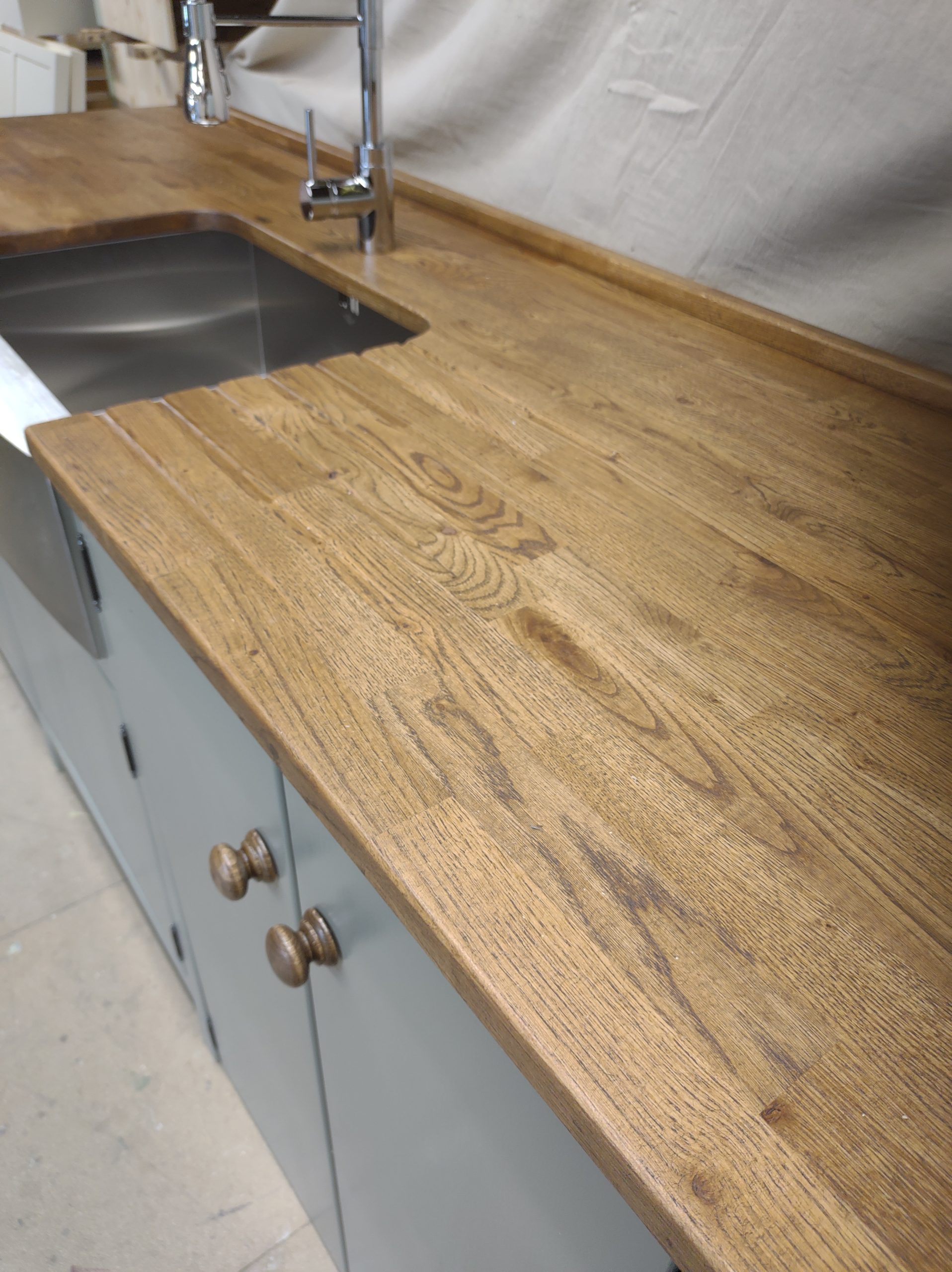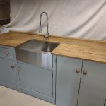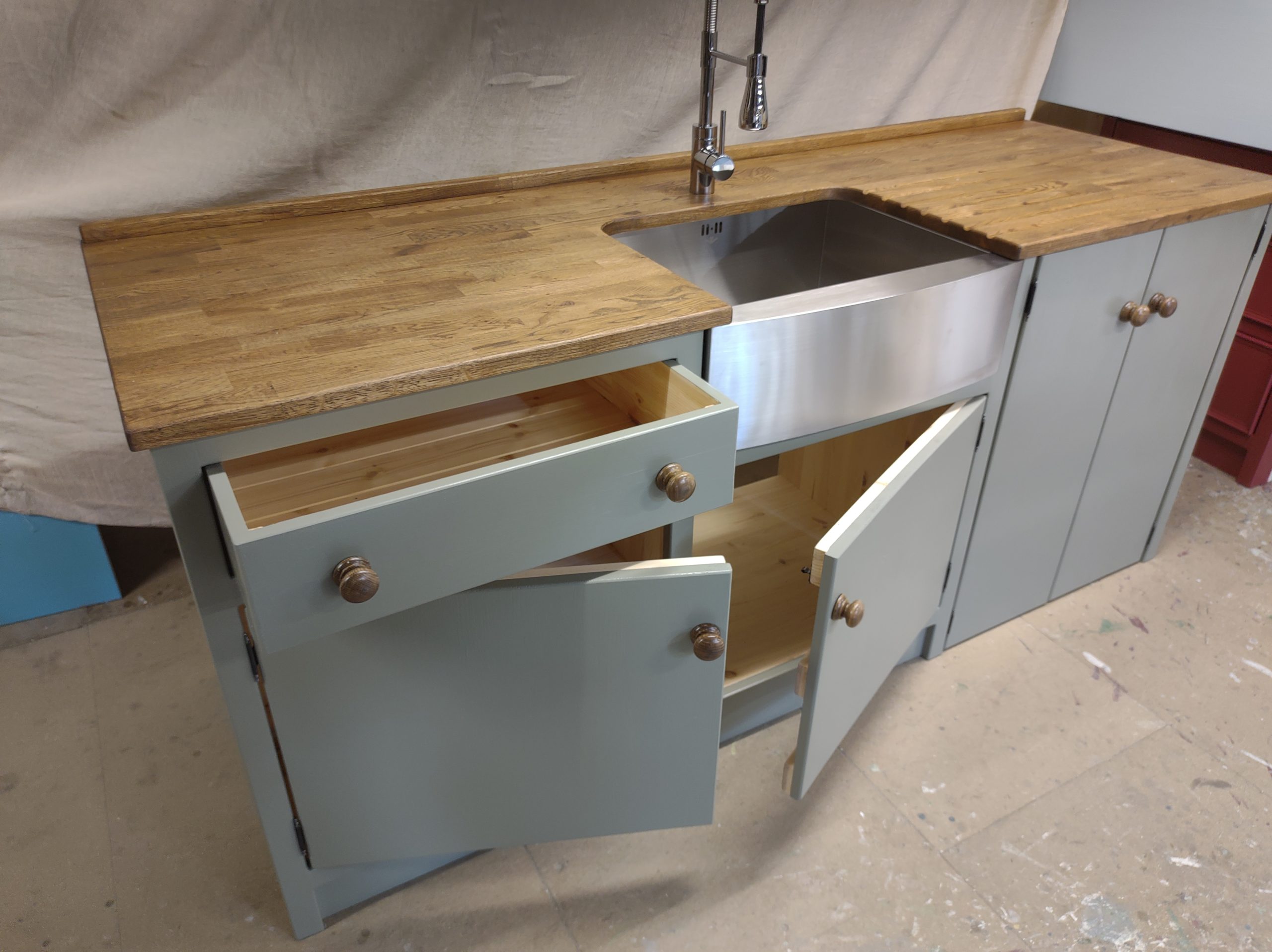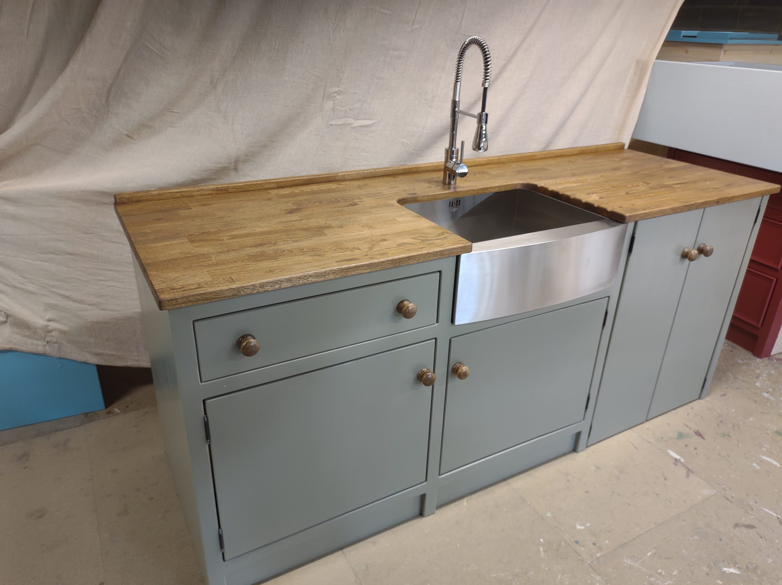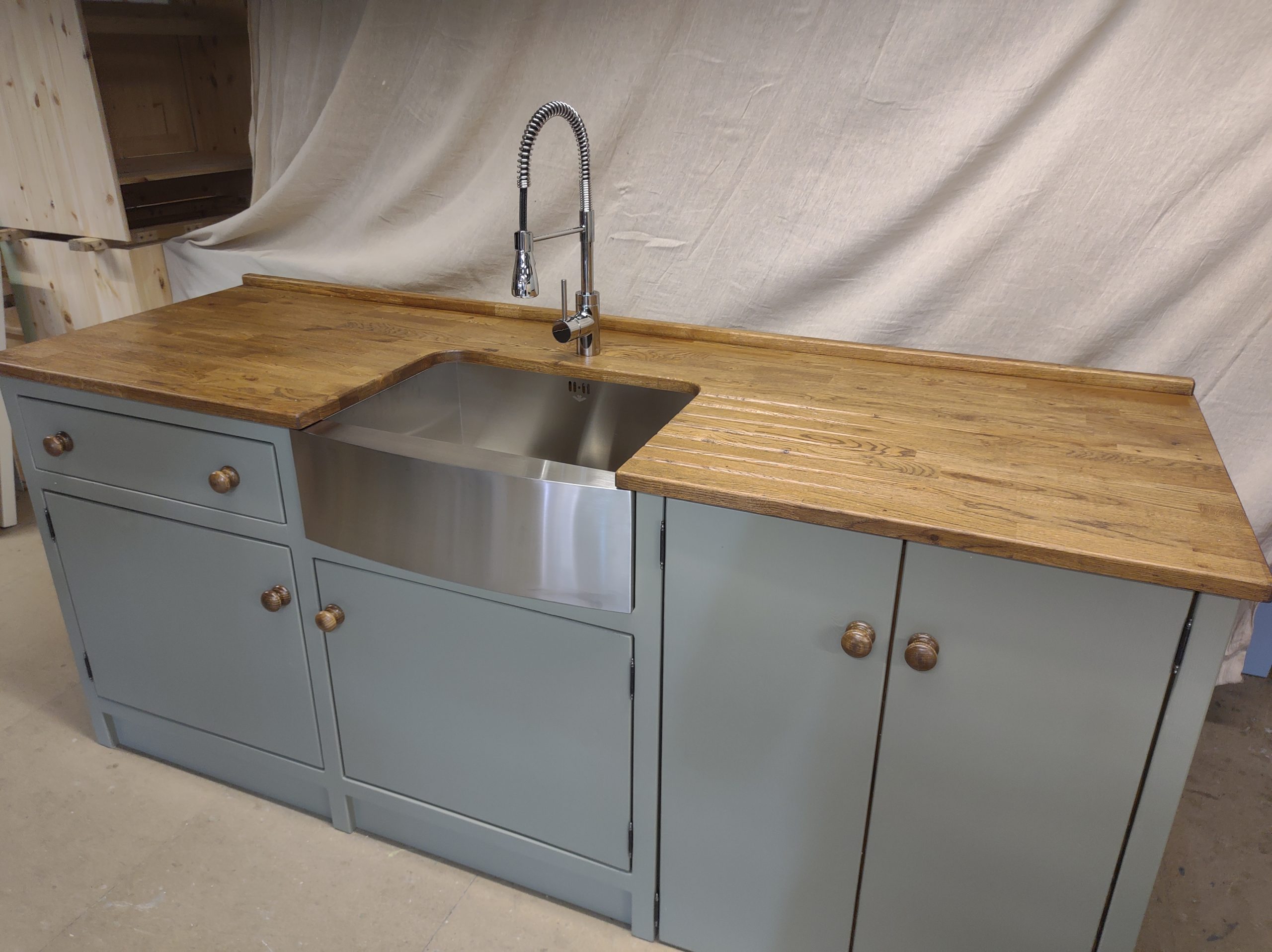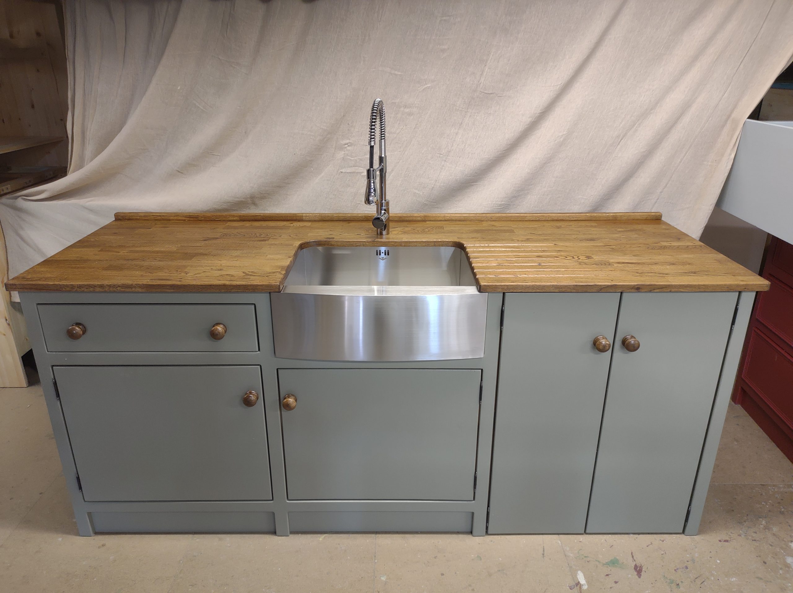 HAND PAINTED IN THE FARROW AND BALL 'TRERON',KNOBS-'OAK ANTIQUE'.COMPLETE WITH 600MM STAINLESS STEEL BELFAST SINK/CHROME SPRAY MIXER TAP,25MM PINE WORKTOP. STAINED IN 'OAK ANTIQUE' (PLEASE NOTE THE PICTURE SHOWS A 25MM OAK WORKTOP- A CONFIGURATION WE CAN NO LONGER OFFER)