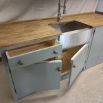 A HANDMADE SINK/FREESTANDING APPLIANCE UNIT.MADE IN OUR WETHERBY WORKSHOP FROM SOLID PINE,DESIGNED TO HOUSE A FREESTANDING APPLIANCE TO THE RIGHT OF SINK,WITH A FLIGHT OF DRAWERS TO LEFT.MADE WITH FLAT FRONTED DRAWER AND DOORS FOR THAT MODERN STREAMLINE LOOK.