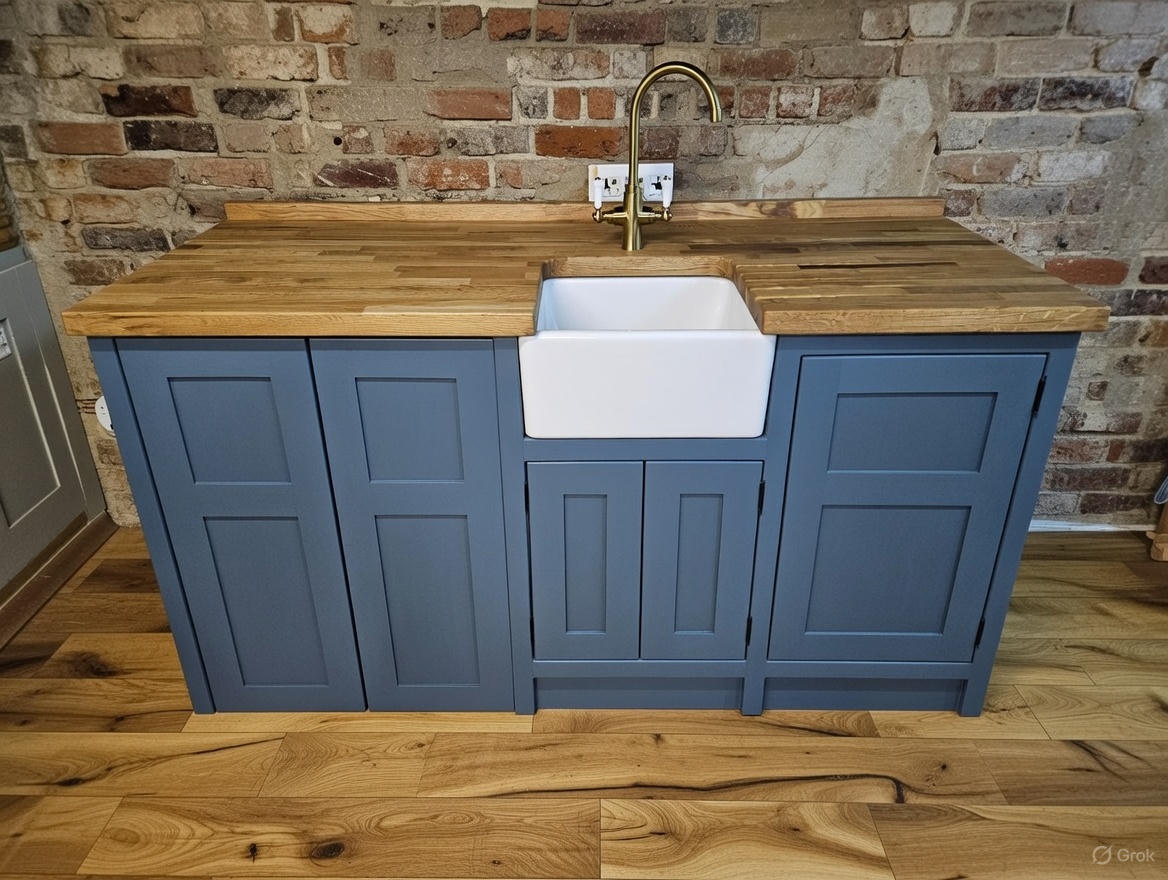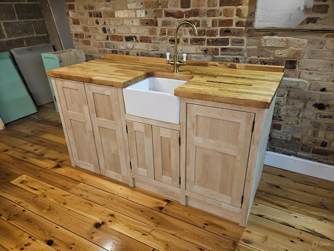 The 40mm oak worktop upgrade has been included but the unit is unpainted so you can choose your own colour for the cabinets.