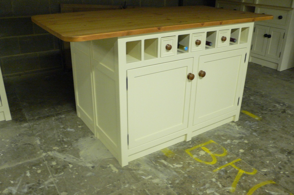 This Island With Seating Area And Winerack Painted in tallow (F&B) with a 25mm Pine Worktop (pictured) and matching wooden handles (but feel free to choose your own colour combination. Price includes delivery within 250 miles, please note some final assembly may be required and this is not included.