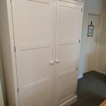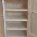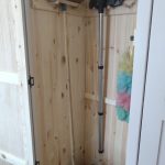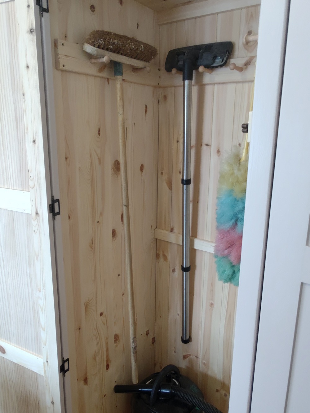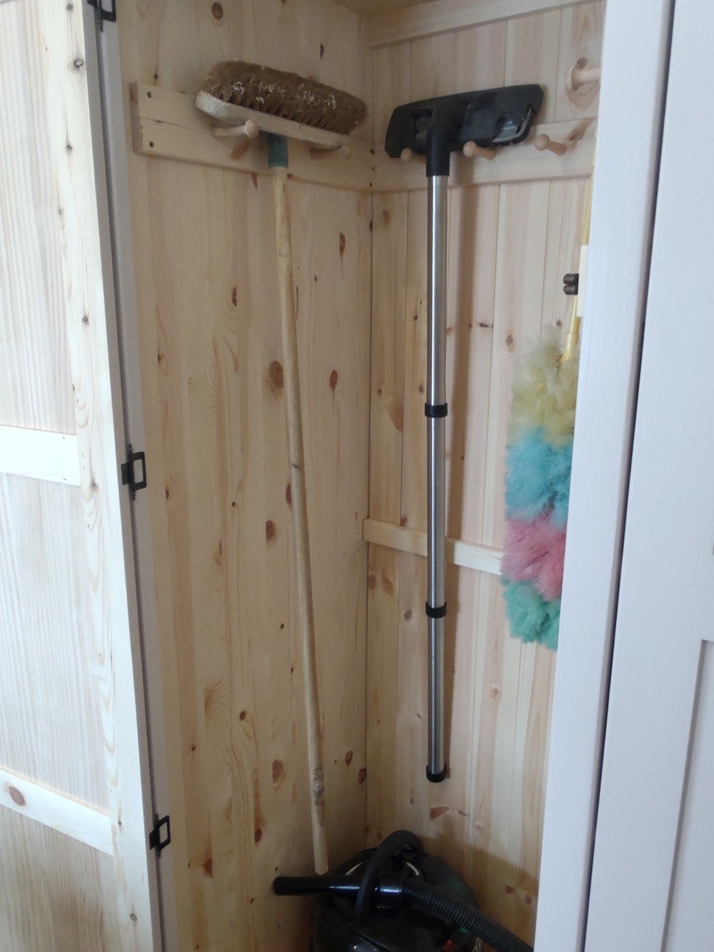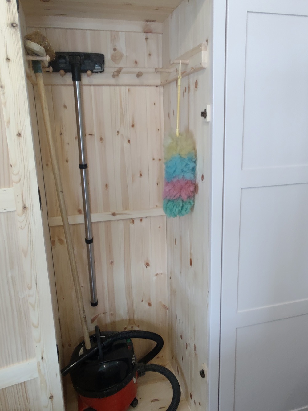 This unit comprises of a large cupboard on the left with space for brooms, mops, buckets and hoovers with timber hooks.