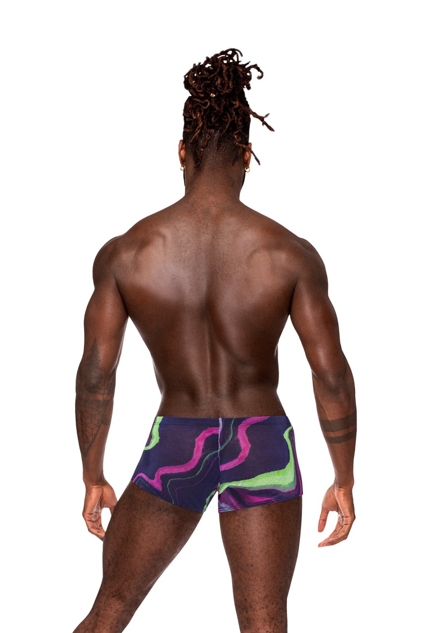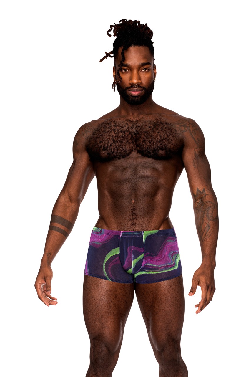 From the Galactic collection by Male Power, the Mini Short features a fabric covered no roll waistband, elasticized high cut legs and a contour pouch.