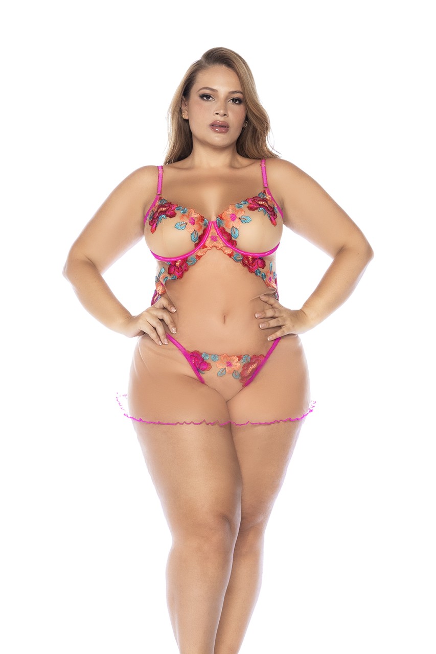 This enchanting babydoll is designed in colorful, embroidered sheer mesh, with delicate floral embroidery strategically placed to enhance and flatter your silhouette. Featuring underwire and adjustable straps and a matching G-string.