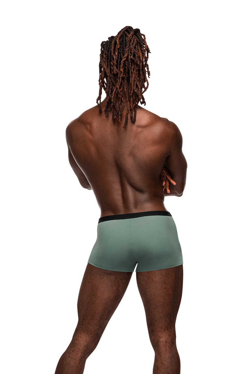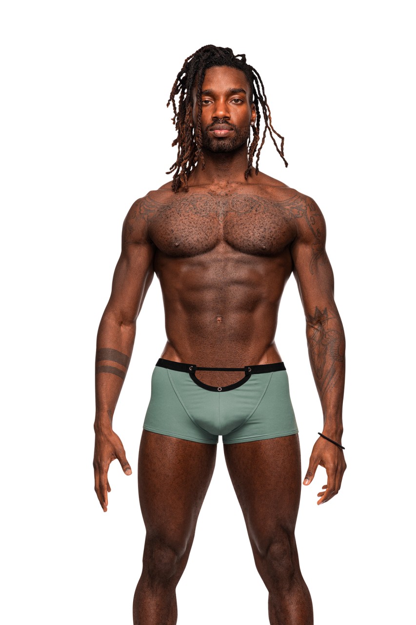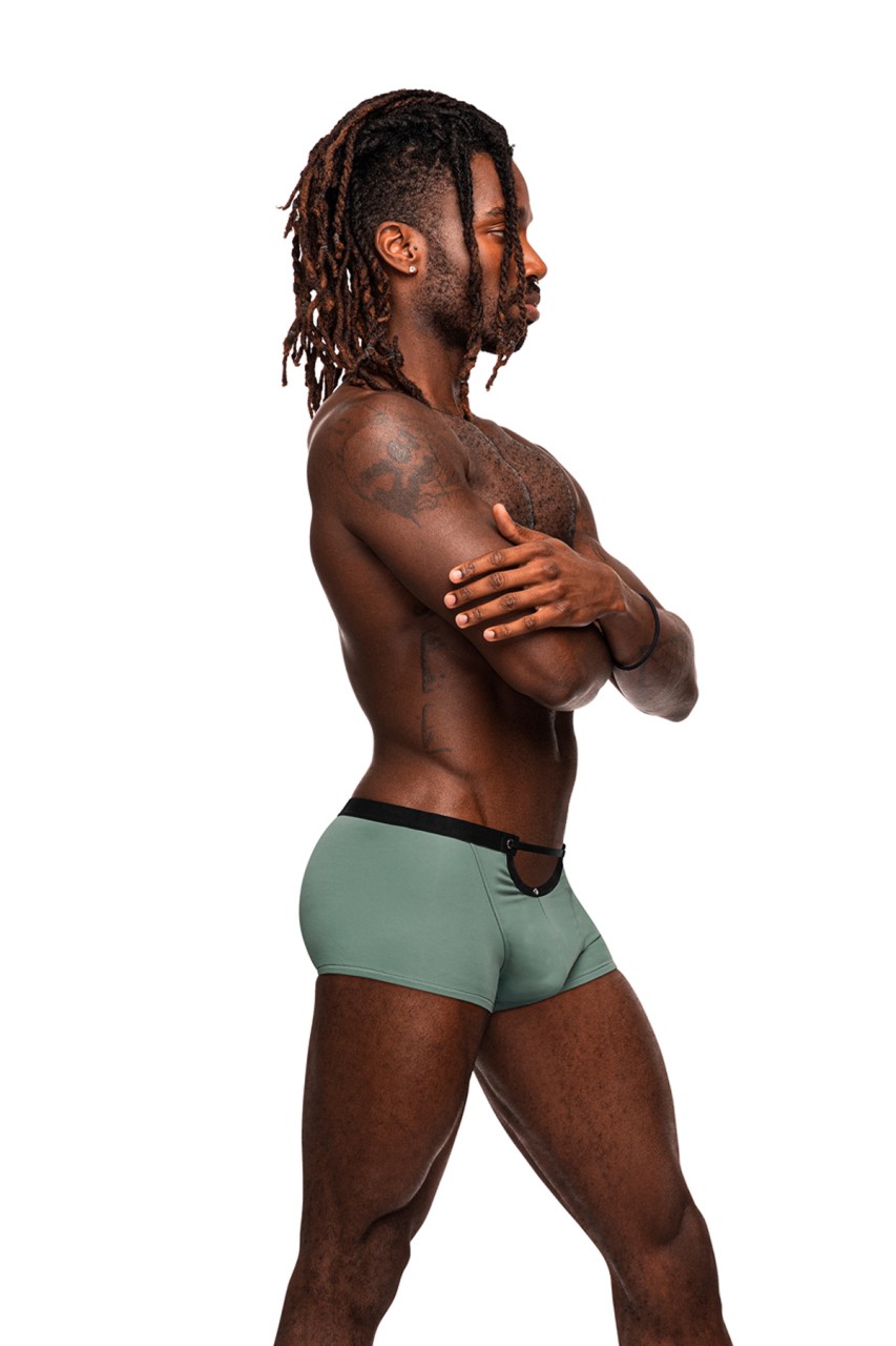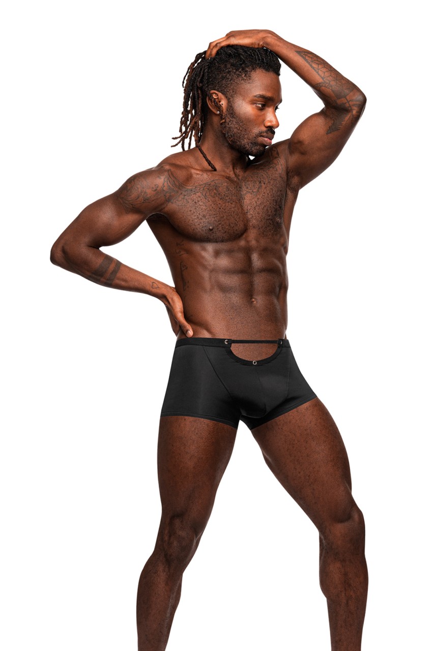 From the Male Power Magnificence collection this style includes a Mini Short with a cut out window on the waist, decorative metal grommets, and a slim, stay put plush elastic waistband. Luxuriously smooth and soft this micro fiber blend offers all way stretch with a deluxe feel. Plush elastic waist and leg bands , metal grommets. Hand wash separately, cold water, line dry, no bleach