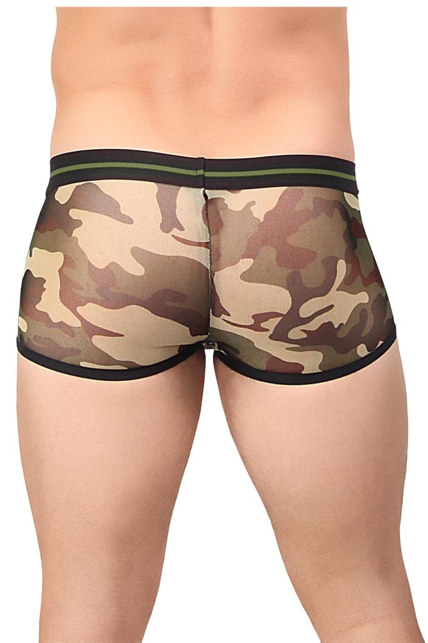 Sheer Camouflage mini short features comfort fit pouch, plush elastic waistband with skull emblem and contrasting plush elastic trim.85% Nylon 15% Spandex