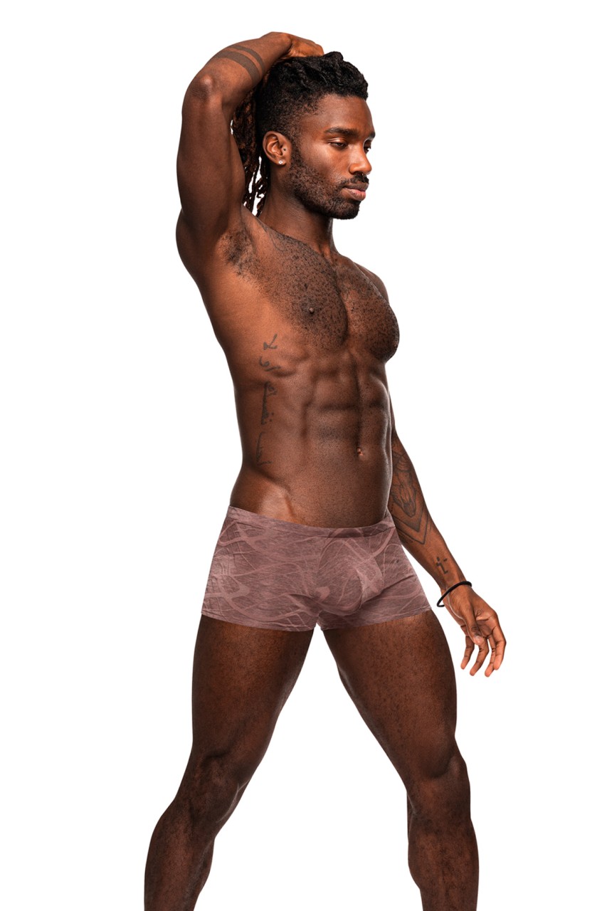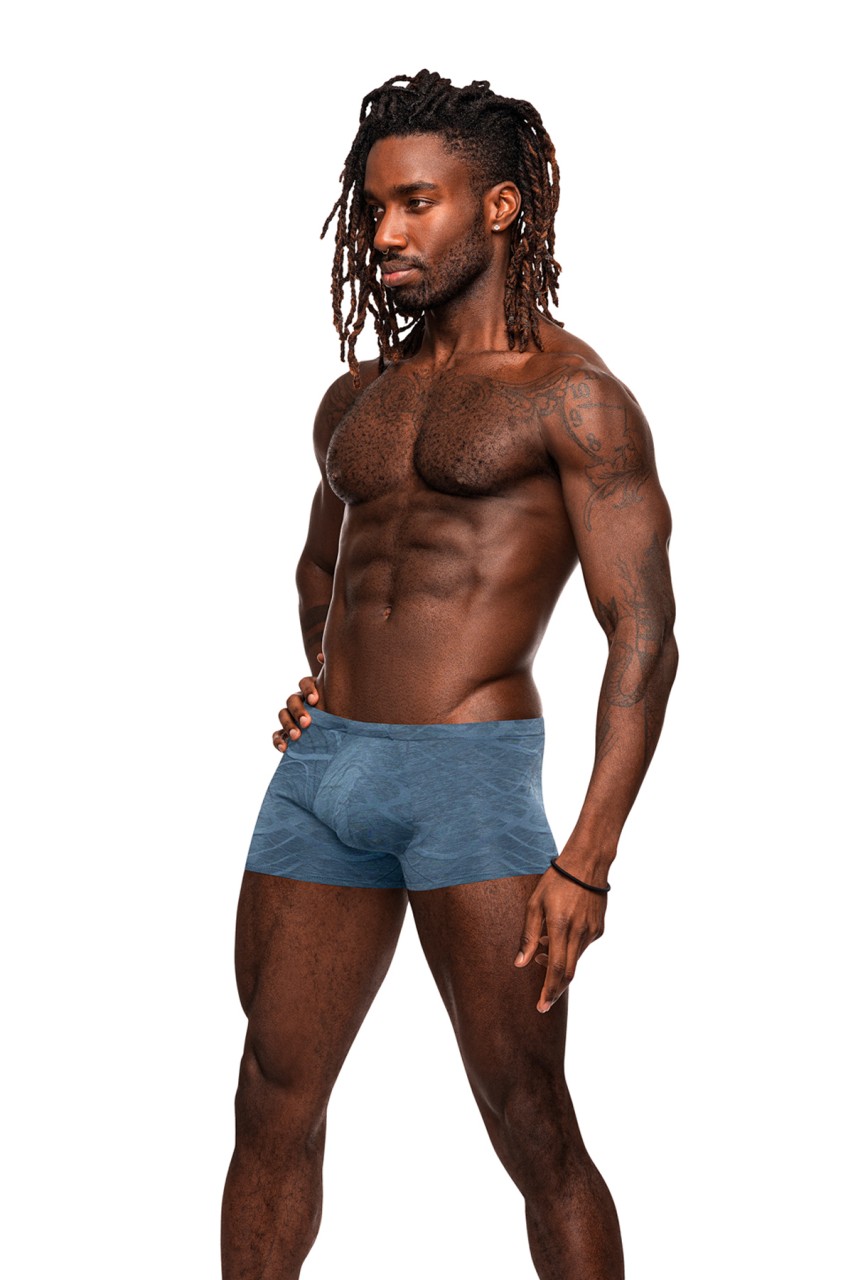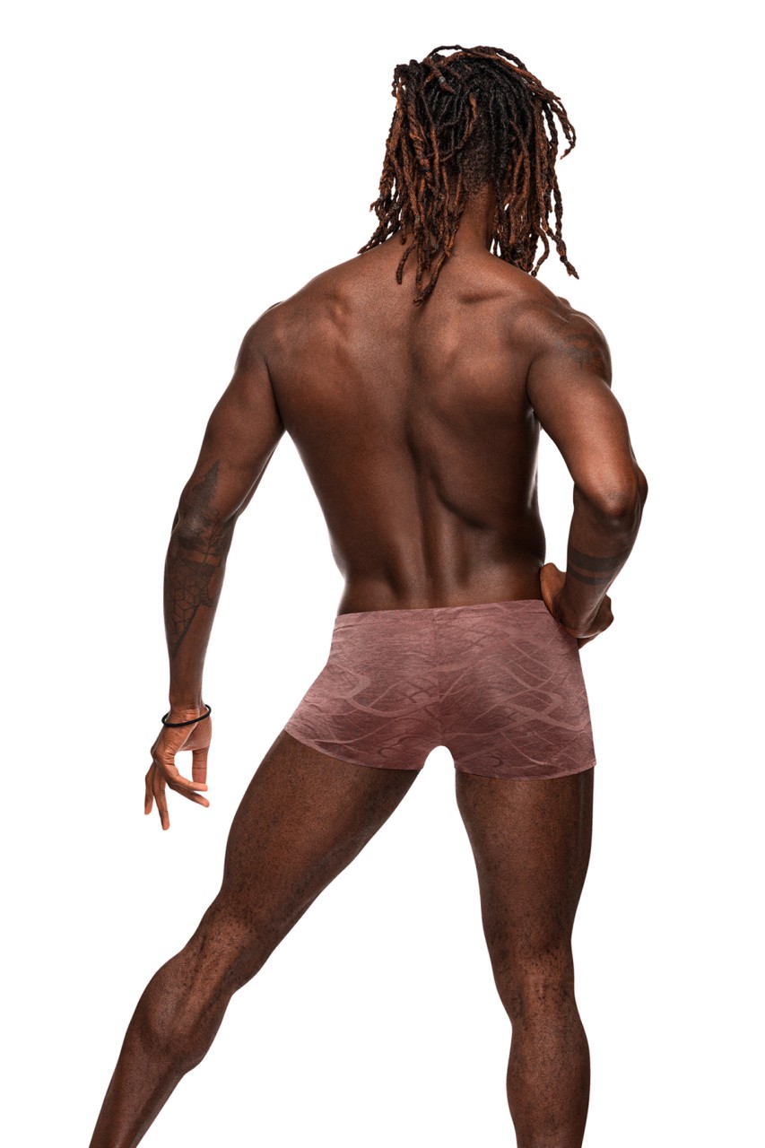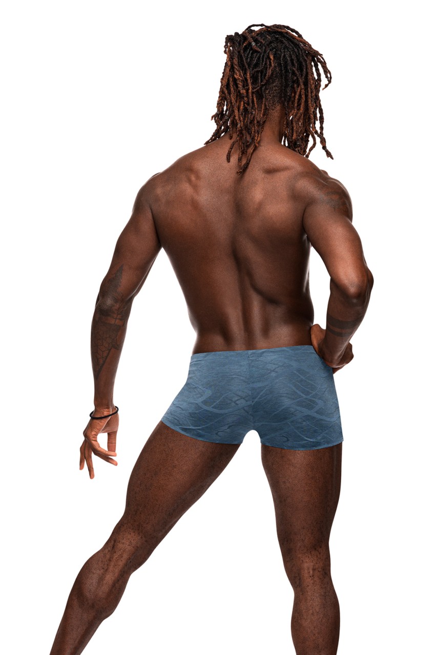 From the Male Power Inter-mingle collection this style includes a mini short with a low cut waist, high cut legs, a contour pouch and full rear coverage. Cool stretch poly spandex with an embossed tone on tone print joining both flat and raised graphics throughout. Hand wash separately, cold water, line dry, no bleach